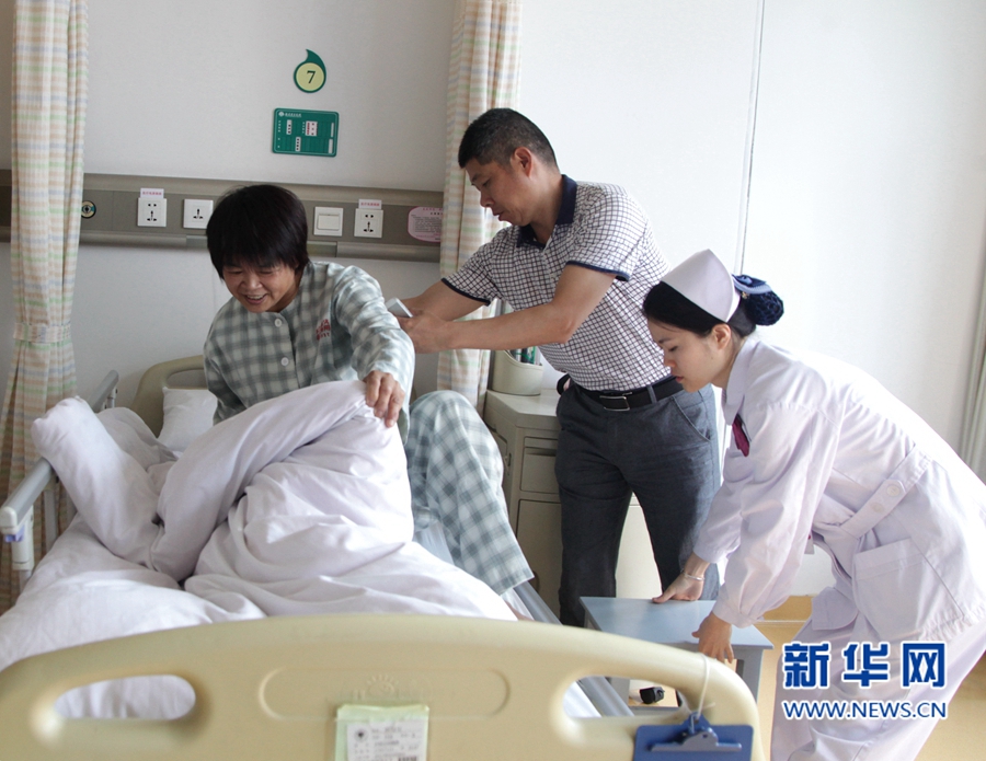 福建省立医院日间病房,护士和家属正在照料患者张绿豆。新华网 肖和勇 摄