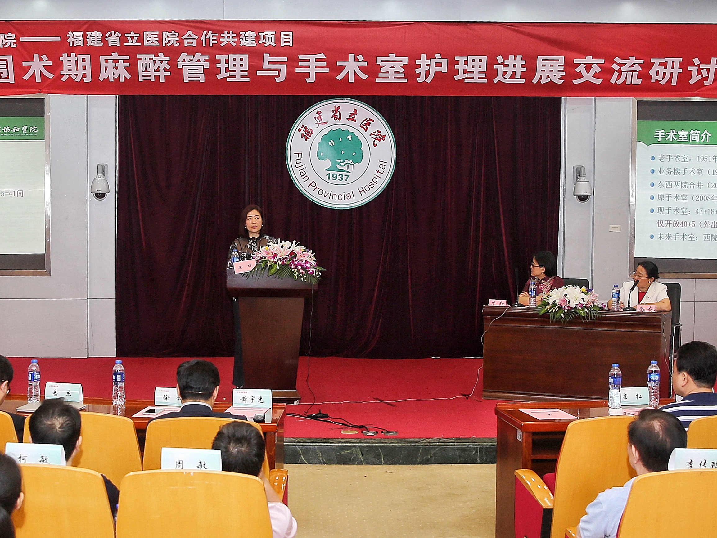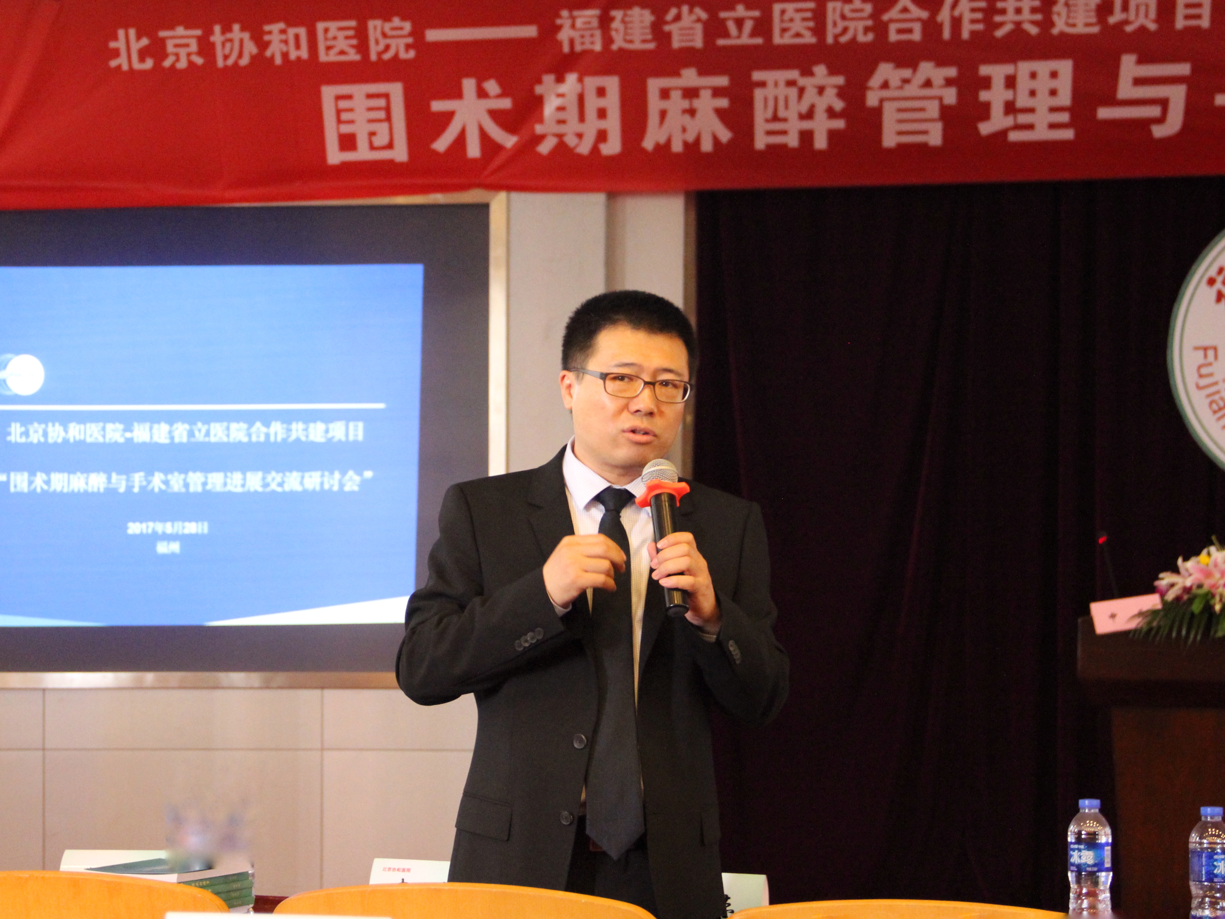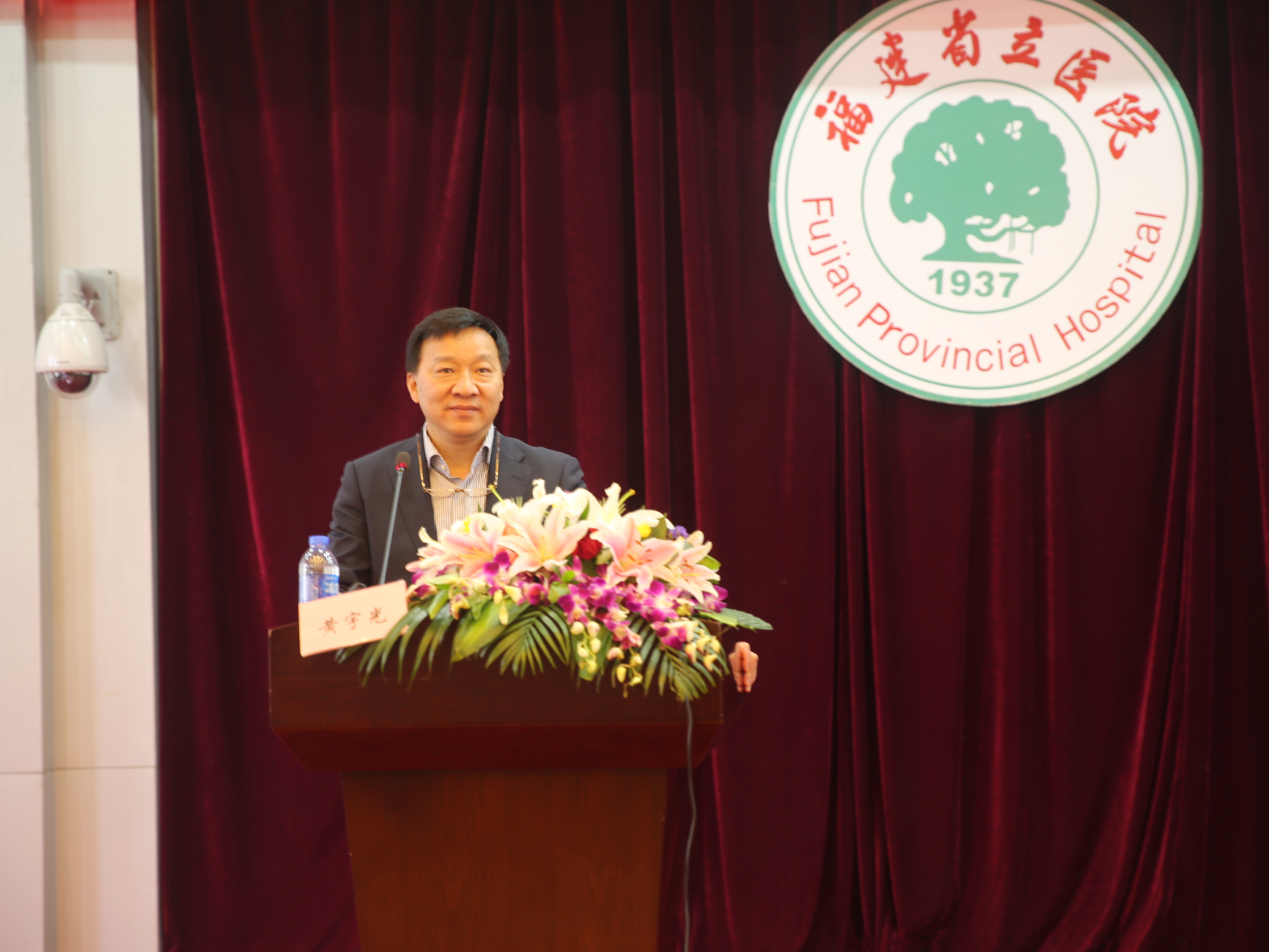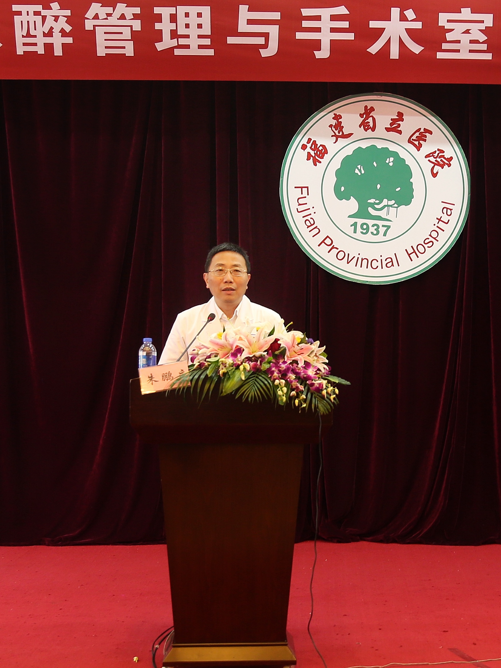 福建省立医院院长朱鹏立教授致辞,向北京协和医院专家团队表示感谢,希望通过举办高水平的学术论坛,加强两院学术交流,推进福建省立医院麻醉学、护理学及各科室的发展。