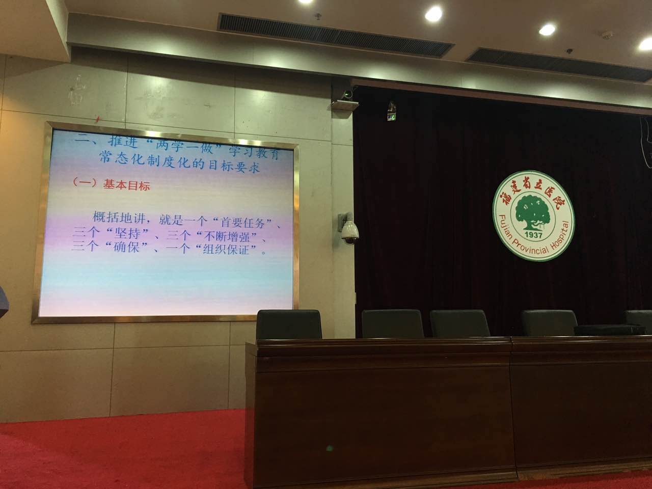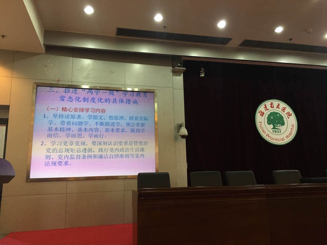 我院离退休党支部切实抓好“三会一课”制度,继续开好以“两学一做”为主题的党支部组织生活会。广大党员克服居住分散、年龄高行动不便等种种困难,每次都能坚持参加党支部组织生活会。为庆祝中国共产党成立96周年,在七一前夕(6月30日上午),离退休党支部邀请省委党校教授为离退休党员讲了一堂主题为“推进‘两学一做’学习教育的常态化制度化”的党课,地点设在医院学术会议厅,离退休党员100余人到会参加学习。陈教授主要从学习教育常态化制度化的意义、目标要求和具体措施三个方面内容进行讲述。通过这次党课,全体党员加深了对“两学一做”学习教育的常态化制度化重大意义和重要作用的理解和认识,他们将更加自觉地学好党章党规、学好习近平总书记系列重要讲话,努力做一名合格党员,为党和人民的事业增添正能量。在党课前,老干处陈英处长(离休支部书记)把今年省卫计委和医院的重要党建工作任务做了说明。并认真宣读了中共福建省卫生计生委党组关于印发的《认真学习贯彻习近平总书记重要指示深入开展向廖俊波同志学习活动的实施方案》,号召全体党员向先进学习,把学习先进与继续开展“两学一做”结合起来。