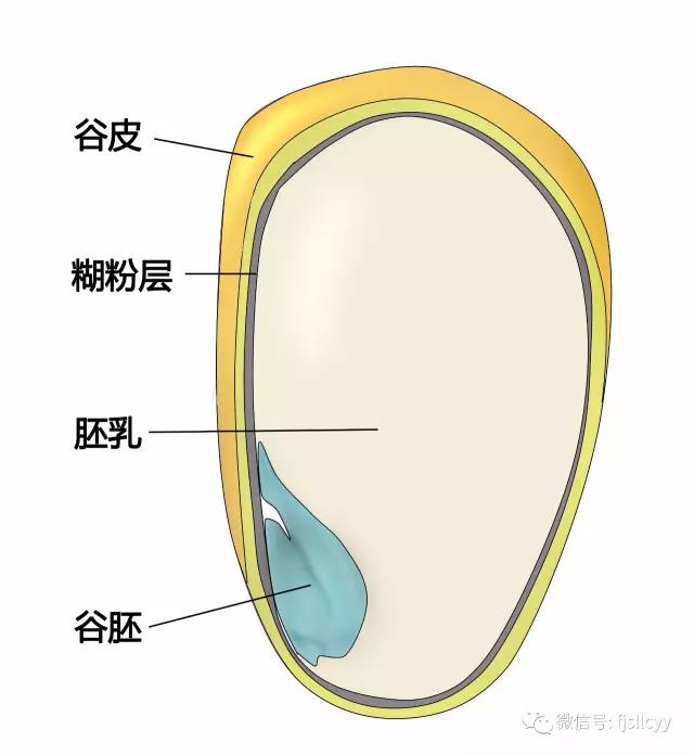 常见的谷物如大米、小麦、小米、玉米、燕麦、薏米等都属于禾本科植物,其果实称为“颖果”,具有相似的结构,果皮和种皮紧密结合,很难分开,所以经常把果实直接称为种子。这样的果实去掉果壳后,还有四个结构,从外到内分别是谷皮、糊粉层、胚乳及谷胚。其中: