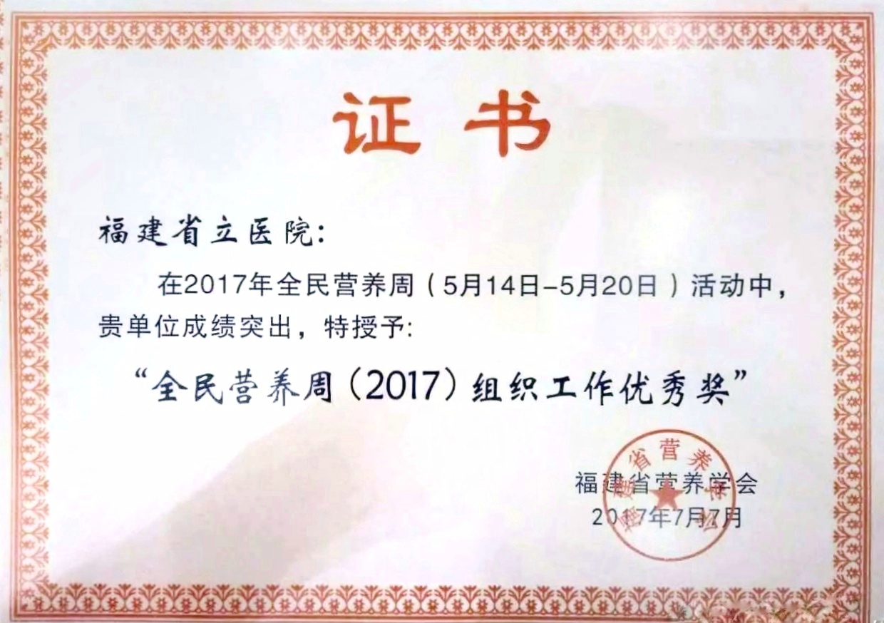 我院特诊一科吕心阳副主任医师为首届省临床营养专业委员会主任委员,陈妍副主任护师当选专委会常委,6人当选专委会委员。同时,福建省立医院及省立金山医院获得大会组委会颁发的“全民营养周(2017)组织工作优秀奖”。