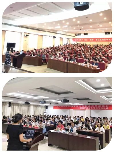 7月20日、7月27日分别由北京协和医院外科马玉芬总护士长、内科赵艳伟总护士长、妇儿五官科薄海欣总护士长带领其护理团队12人到我院进行精彩的专题讲座和护理查房交流。来自福建省立医院、福建省立医院南院、福建省立医院北院、福建省立医院武夷分院、福建省康复医院共300余名护士长、护理骨干聆听了专题讲座。北京协和医院护理专家从护士的培养、专科的发展、护理领域新进展、新技术等方面进行了专题介绍。