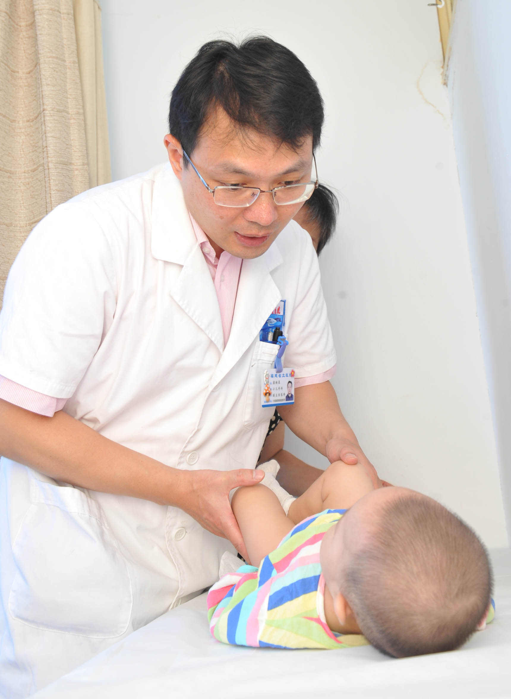 一名3个月大的女宝宝家长觉得宝宝腿纹明显不对称而从外地赶来参加义诊,经小儿外科康映泉副主任医师触诊发现其左侧髋关节有滑动迹象,后在超声科陈玮吉副主任医师诊查下发现宝宝左侧髋关节完全脱位。