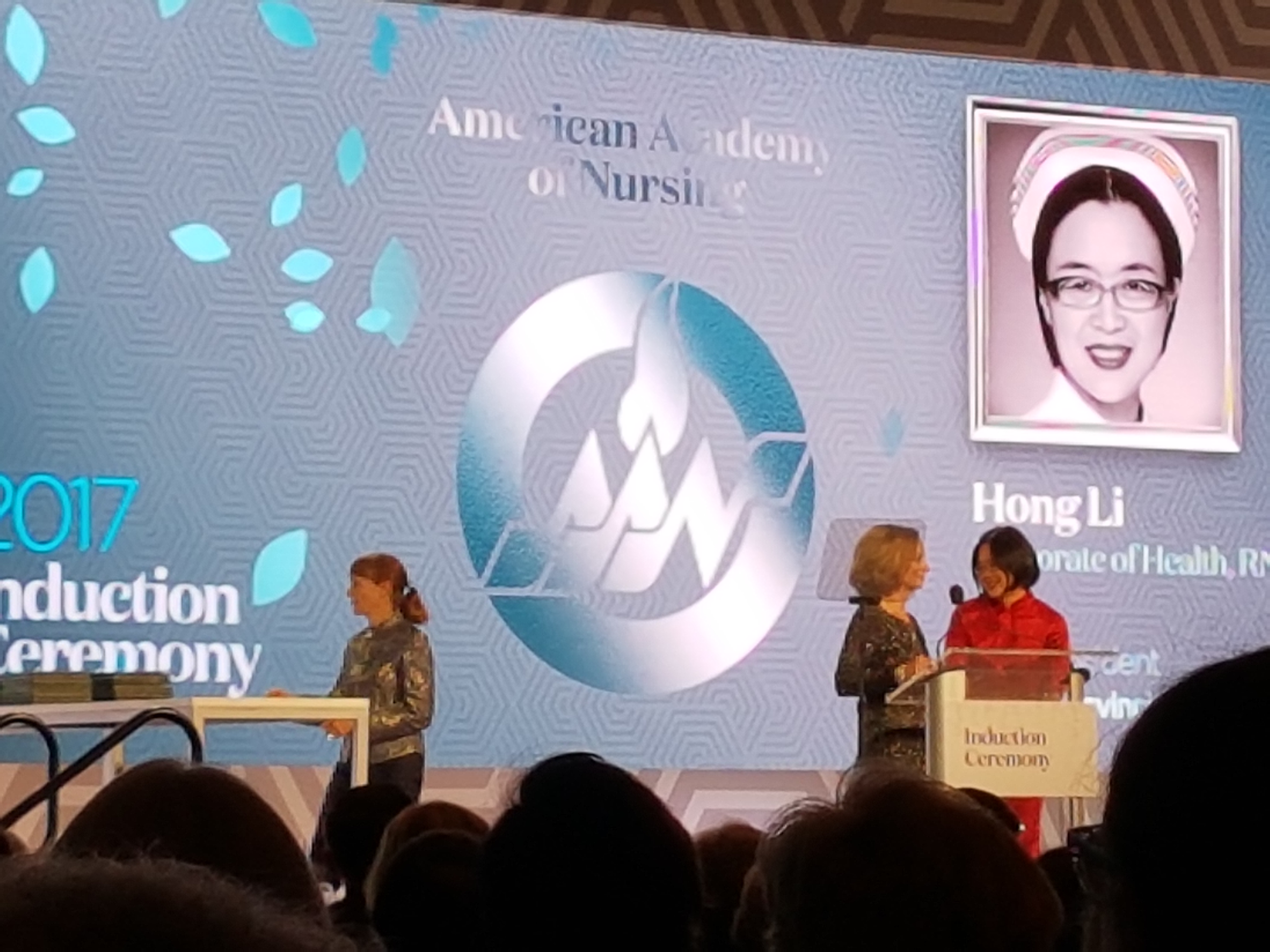 美国卫生及公共服务部原副部长Mary Wakefield博士和护理管理研究院院长Stephanie博士向本届来自中国大陆的唯一院士表示祝贺