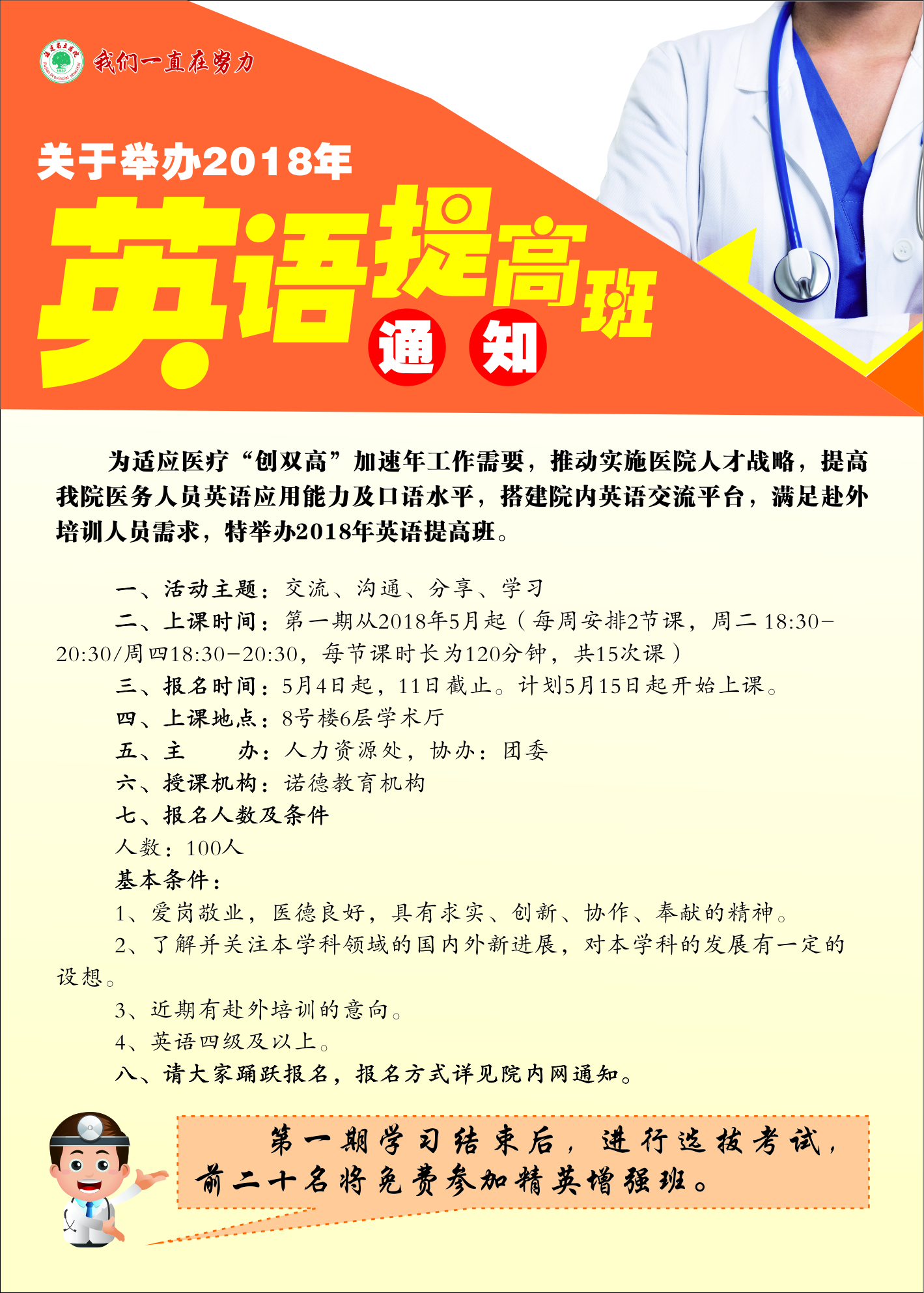 工欲善其事,必先利其器。英语作为重要的国际交流工具,是现代医务人员必备技能之一。近日,我院举办英语培训(提高)班的通知引起医务人员的广泛关注。宣传海报发布后,同事们热烈响应,纷纷利用微信朋友圈等转载,报名者络绎不绝。
