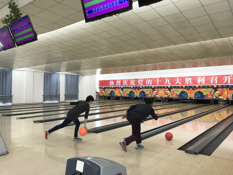 在清脆的球、瓶撞击声中,选手们相互交流,切磋技艺,击掌喝彩,保龄球馆内洋溢着紧张有序而又团结和谐的气氛。