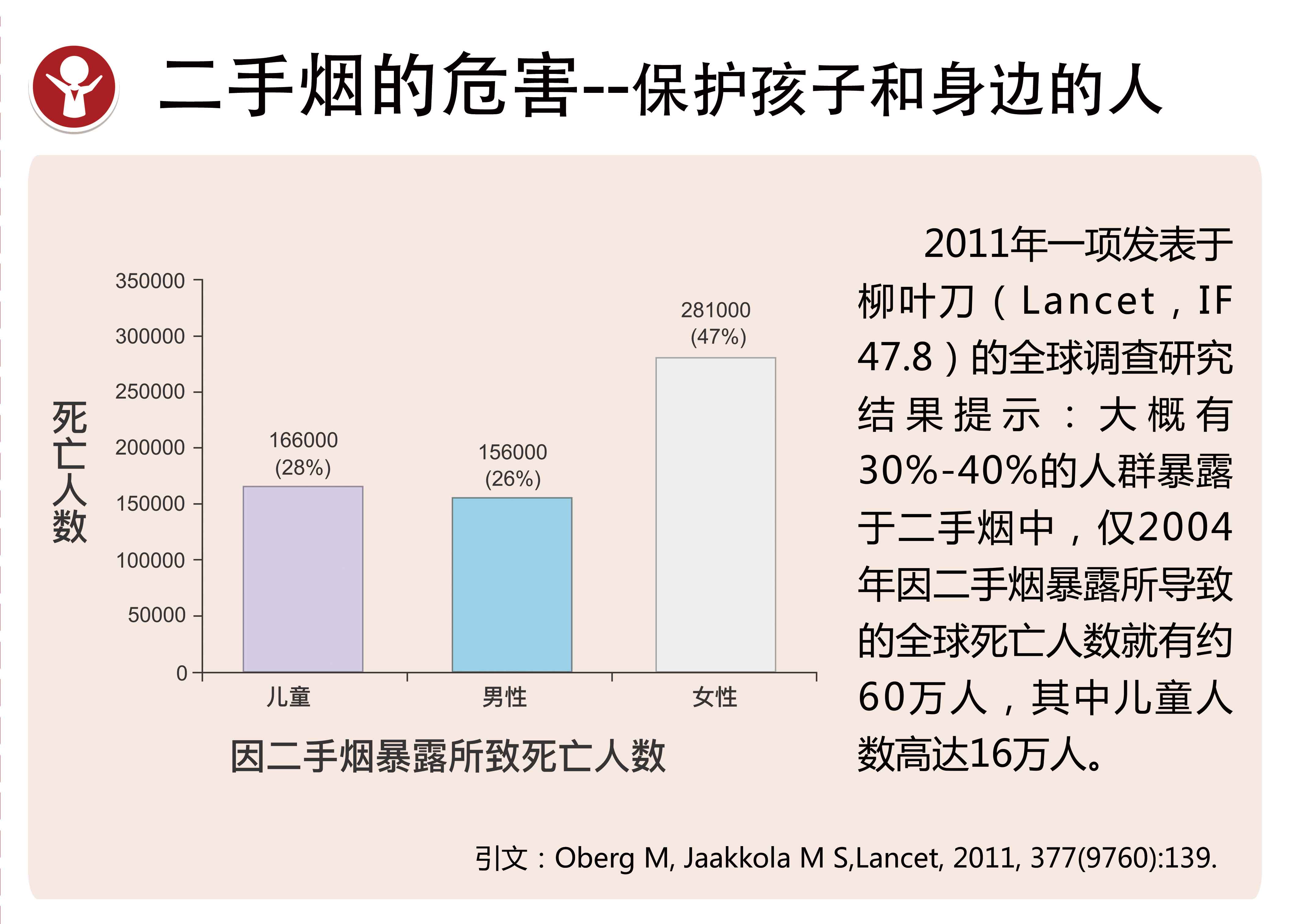 “我们每个人在乎PM2.5超标,在乎雾霾,为什么烟民天天吞云吐雾制造雾霾,大家却不在乎呢?”朱医生说。吸烟不仅危害自己的健康,产生的二手烟还会危害身边的人。比如孩子,2011年一项发表于《柳叶刀》(全球顶级医学期刊,记者注)的全球调查研究结果显示,仅2004年因二手烟暴露导致全球死亡的人数就有60万人,其中儿童人数高达16万人。比如女性,过去常常将很多不吸烟的肺癌女性患者,病因归结为厨房油烟,但近期相关调查显示,这是长期暴露在二手烟中造成的伤害。