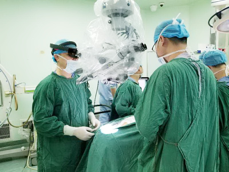 患者老陈(化名)79岁,患有先天寰枢椎发育不良,曾经受过外伤,导致枢椎齿突骨折,逐渐发展成寰椎脱位,压迫脊髓,出现四肢无力、行走困难的症状。手术时,徐杰主任戴上MR眼镜,“直视”重叠在真实病灶上的3D成像立体模型,随着手术的进行,模型被实时缩放、旋转、移动,手术区域一览无余,大大提高了手术精准度和安全性。