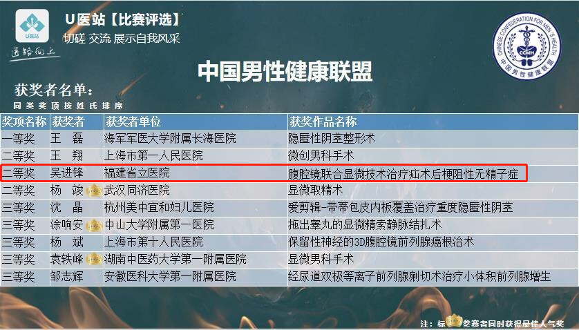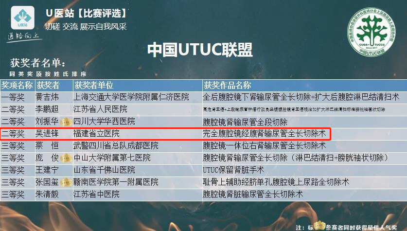据悉,此次比赛由现任中华医学会泌尿外科分会主任委员孙颖浩院士首次组织九大联盟同时举行手术视频比赛,是国内泌尿外科最高规格的比赛。且此次比赛面向全国泌尿男科医师,不区分地区、年龄,所有参赛视频隐去单位和作者,通过各联盟专家团盲选直接产生,获奖尤为来之不易。此次吴进锋副主任医师通过三种不同术式横跨三个亚专业获奖,充分展示了我院泌尿外科近年来亚专业建设和人才梯队培养的成果。