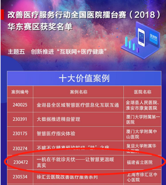 作为首次参赛单位,我院选送了《一机在手 就诊无忧——让智慧更温暖真实》《成立医院服务中心 一站服务,缔造满意》《优质护理下基层 延伸服务促健康》《滴滴出行 百米温情》等四个项目参赛。在华东赛区第一轮竞赛中,我院参赛项目从833个案例中脱颖而出,荣获赛区十大价值案例两项、十大人气案例一项的好成绩。同时,我院作为斩获“十大价值案例”的医疗机构,入围华东赛区小组决赛。