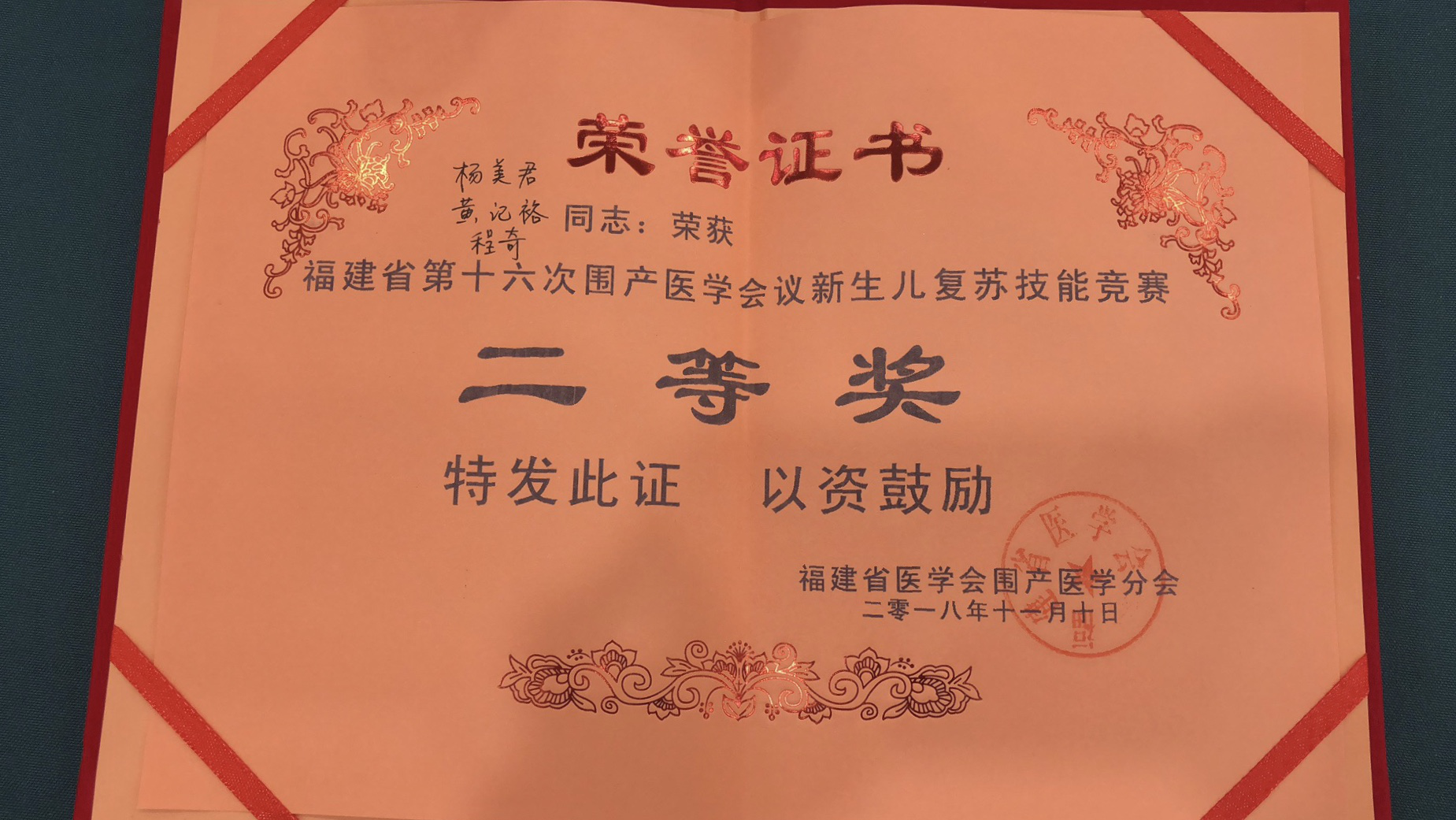 海峡两岸第七次围产医学学术会议暨妇产科新进展全国巡讲暨福建省第十六次围产医学学术会议暨海丝核心区产科危急重症培训班近日在福州举行,大会特设新生儿窒息复苏比赛,我院重症医学五科(NICU)杨美君主治医师、黄记裕医师及程奇主管护师3名医护人员组团参赛,荣获二等奖。