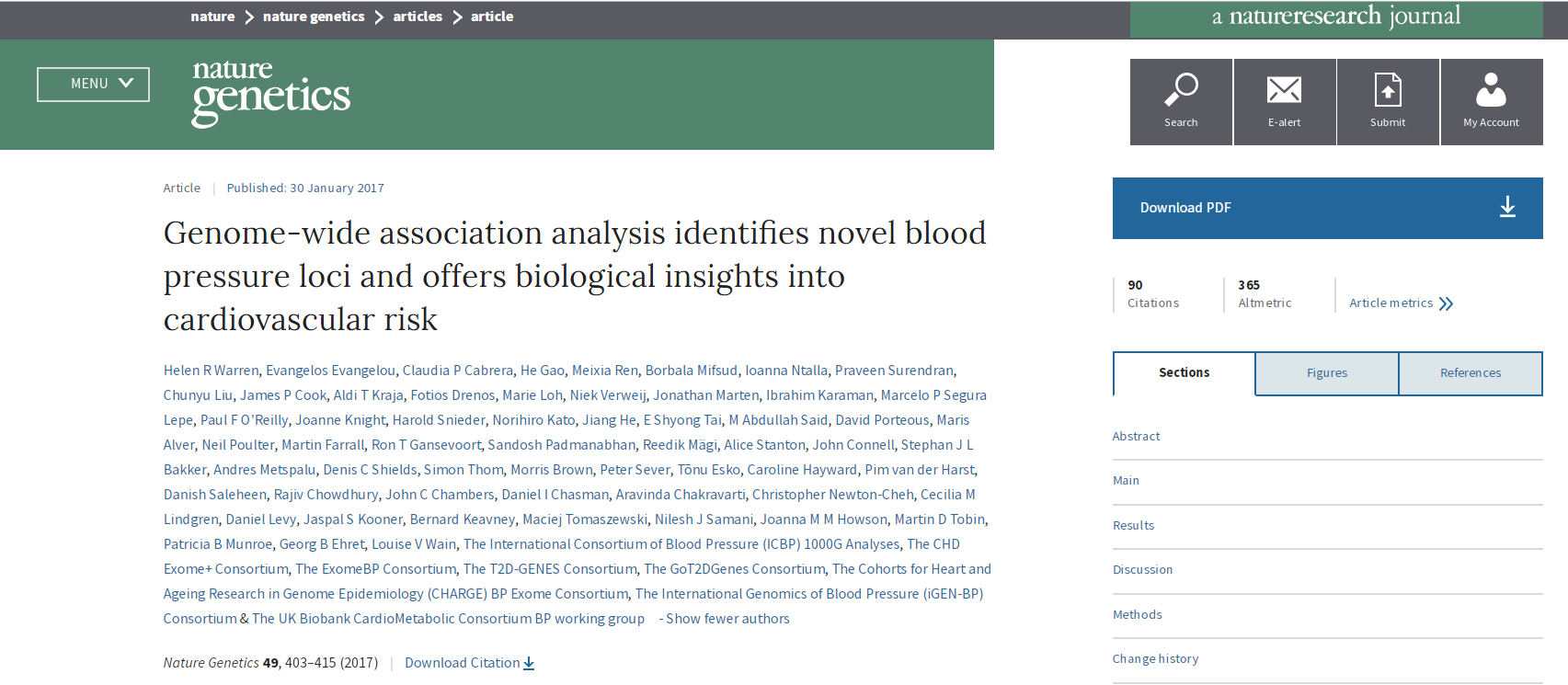 众所周知,高血压是心血管疾病的首要危险因素,且具有高度遗传性。英国基因组首席科学家、巴茨心脏中心Mark Caulfield教授领导的团队围绕基于大样本人群的全基因组学分析,在人类血压、心血管疾病相关基因谱及转化医学等领域开展研究。经过多年努力,一系列具有国际影响的高水平成果相继发表。