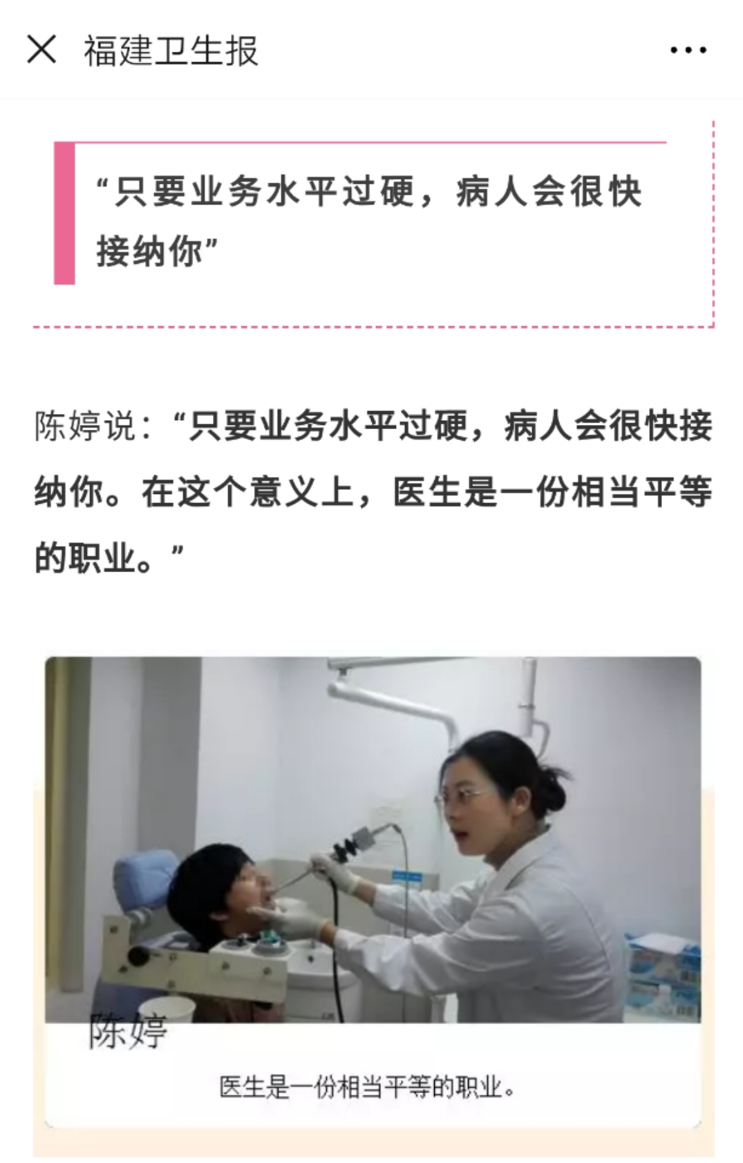 耳鼻咽喉科陈婷主任医师,接受福建卫生报采访,亲述职场修行记。
