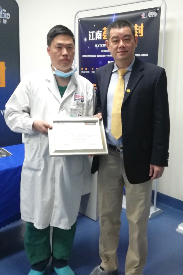 众所周知,中国的房颤和卒中发病率较高,房颤患者的综合治疗特别是卒中预防一直是心内科医生关注的重点。抗凝药物对于房颤患者卒中预防起到了积极的作用,但是在出血风险和患者依从性方面存在不少问题,左心耳封堵术式的出现完美解决了抗凝药物存在的不足,为房颤患者的卒中预防带来新的治疗方法。福建省立医院心血管内三科在郭延松副院长的带领下,吴志勇主任医师和陈新敬副主任医师组成的左心耳封堵团队在房颤卒中的预防及左心耳封堵治疗方面积累了丰富的经验,心血管内三科已成为福建省最大的左心耳封堵治疗中心。其中,陈新敬副主任医师完成的左心耳封堵手术例数全省第一,被授予WATCHMAN左心耳封堵全球带教专家资质,这也是福建省首位获得该资质的专家。