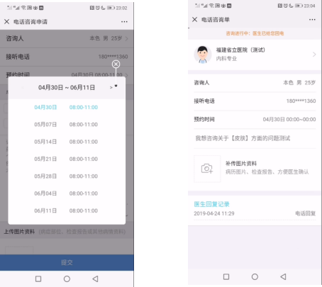 完善咨询单信息,选择预约时间段,提交后会生成电话咨询单,之后等待医生在预约时间段电话回复。