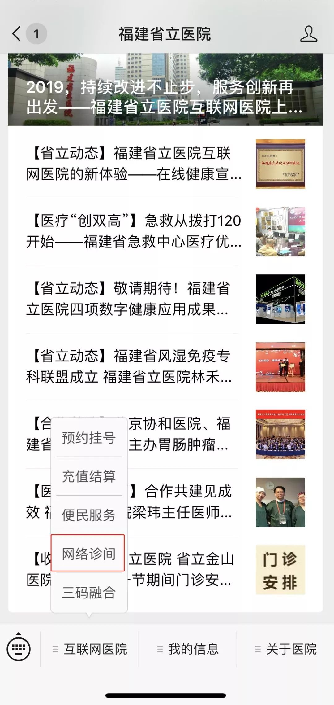 关注“福建省立医院”服务号,在互联网医院中点击网络诊间