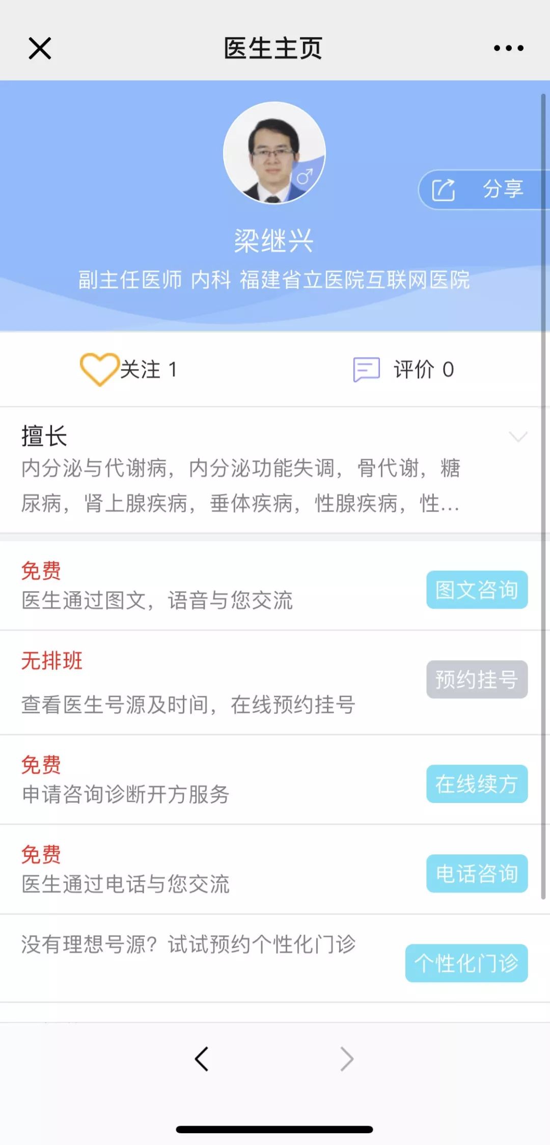 寄语:福建省立医院乘上互联网医院这辆超级快车,使慢性病管理变得更加便捷,增加了患者就医获得感。福建省立医院线上、线下双管齐下为广大患者服务,努力照顾好每一位病人。另外一方面,通过互联网医院平台也为年轻医生提供了更多的表现机会,更为广阔的发挥平台。