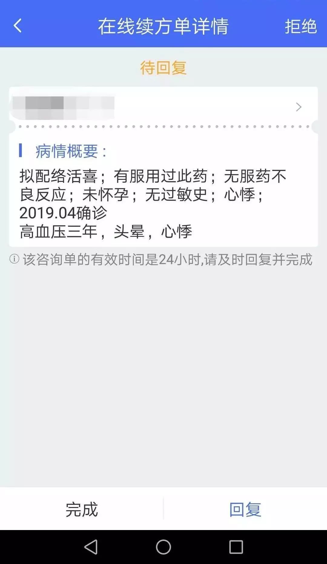 针对慢病复诊患者,可通过慢病续方平台在线发起申请,医生在线调阅其线下就诊记录的病历及处方内容,根据实际情况予以复方,处方还将经过药师的再次审核。患者持医师和药师审核后的处方到药店购药,同时确保了便捷性和安全性。