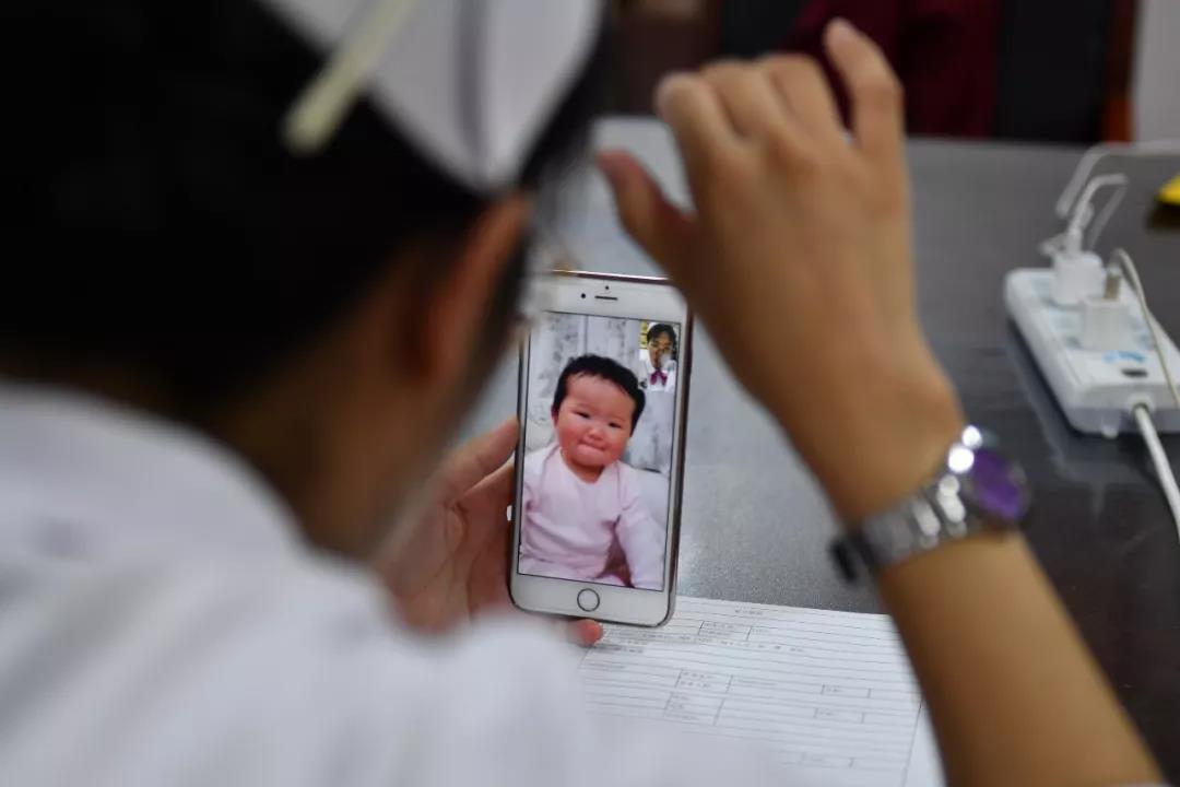 ▲休息室里,刚出车回来的林丽娟与家中九个月的宝宝视频通话