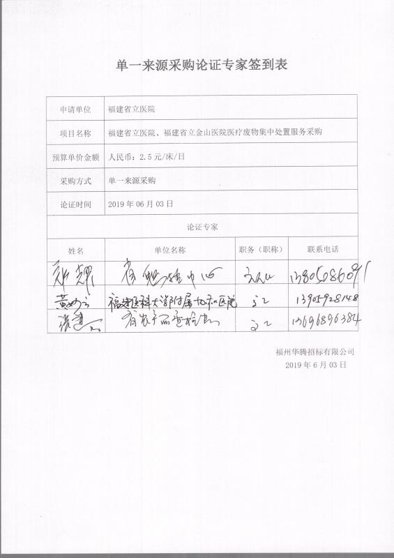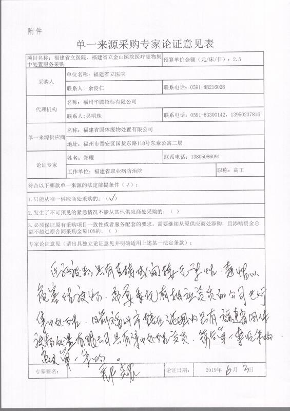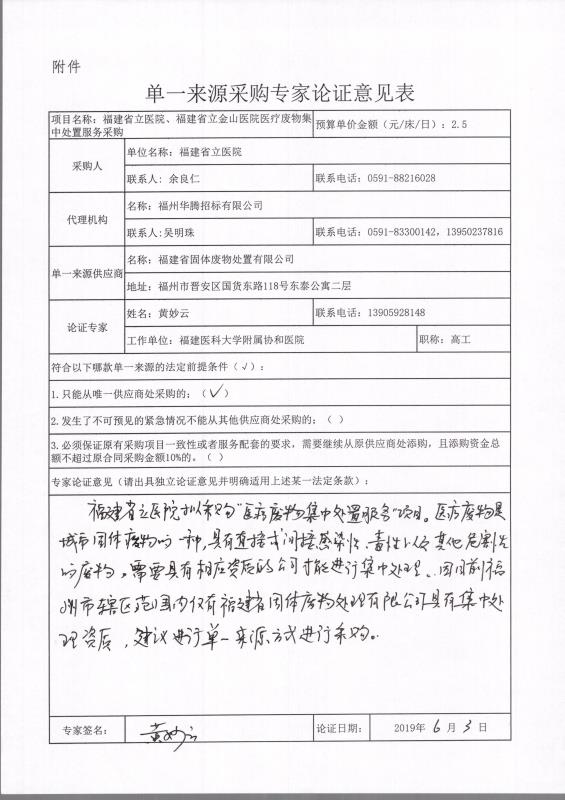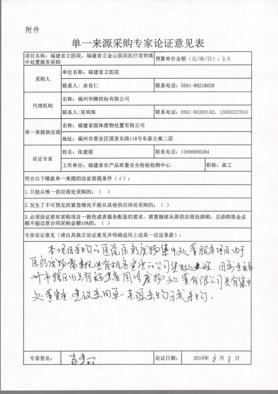 4、采用单一来源采购方式的原因及相关说明:医疗废物(HW01)是具有直接或者间接感染性、毒性以及其他危害性的废物,是城市固体废物的一种,需要委托有相应资质的公司进行集中处理,目前福州市辖区范围内只有福建省固体废物处置有限公司具有集中处置资质,符合单一来源采购要求。