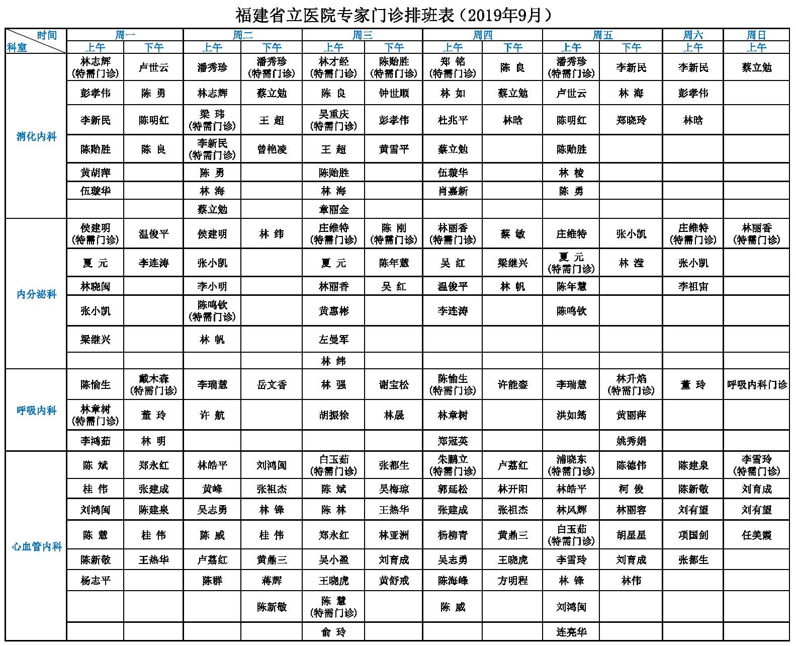 【收藏】福建省立医院、省立金山医院2019年9月专家门诊一览表
