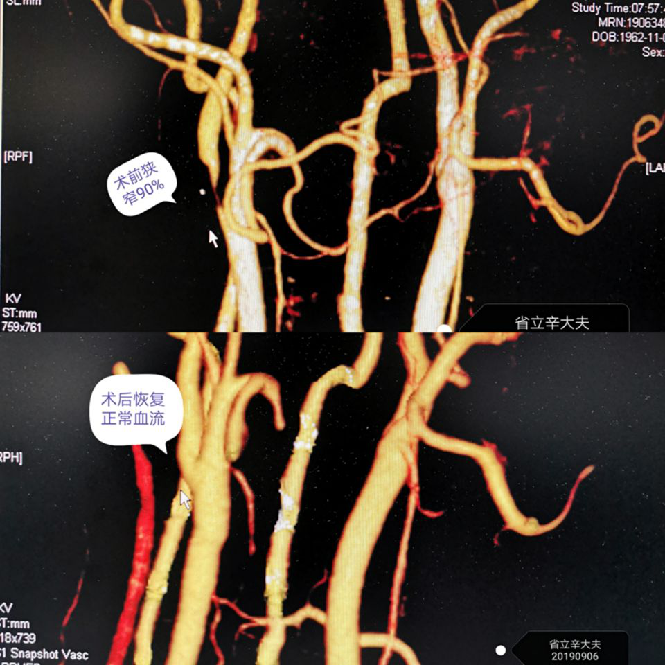 泉港患者柯先生因长期头晕乏力,脑血管供血不足,先后就诊多家医院,被明确诊断为右侧颈动脉重度狭窄,狭窄高达90%。当地医院建议其行颈动脉支架植入术(CAS),考虑到支架的高昂费用及需要后续的终生服药,柯先生始终犹豫不决。家属后来经多方打听,慕名至我院神经外科辛惠宁副主任医师处就诊。