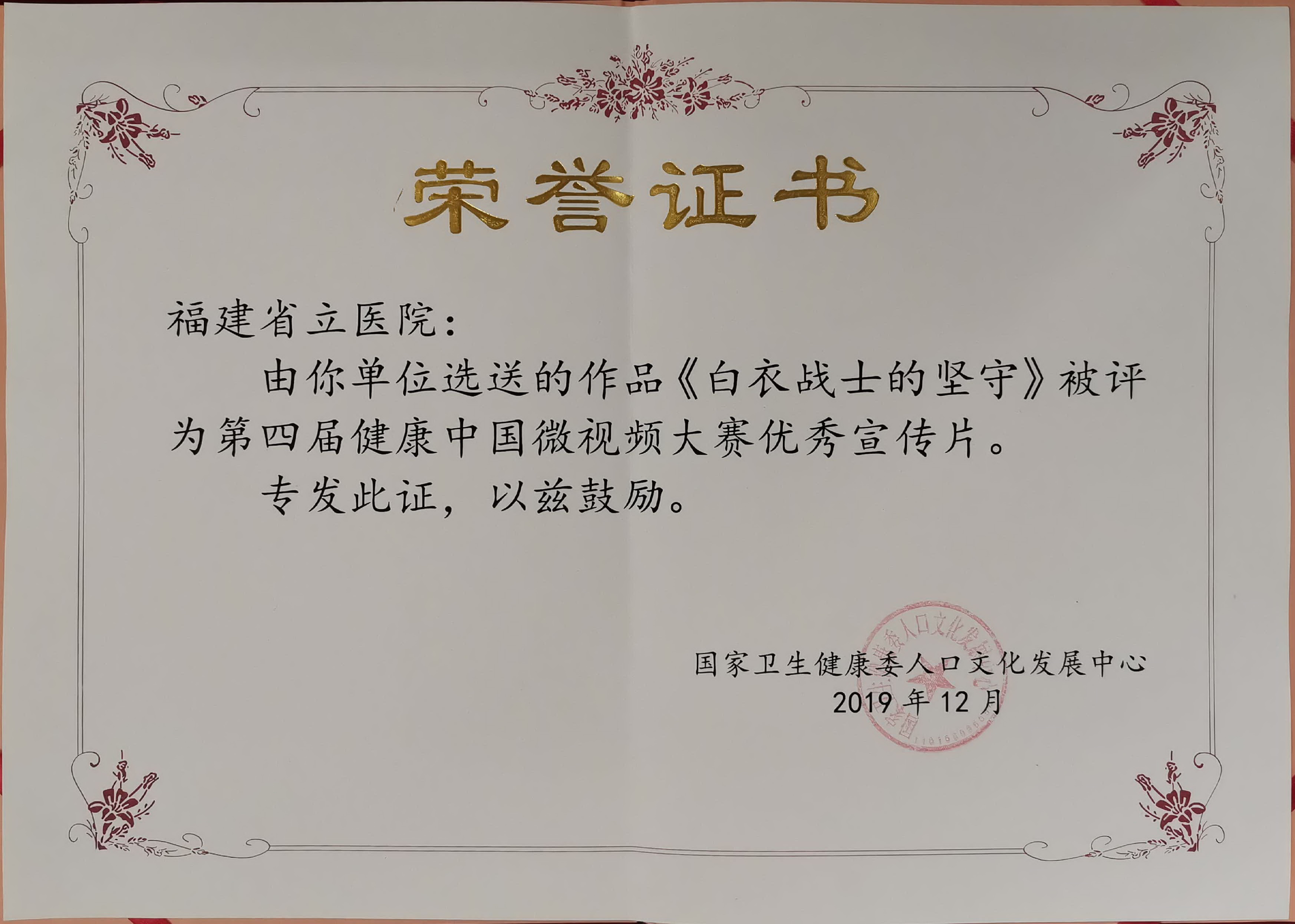 第四届健康中国微视频大赛颁奖典礼同期举行,由福建省立医院倾心打造的我院潘秀珍教授从医70周年宣传片《白衣战士的坚守》,通过层层筛选,从全国各地报送的1500多件作品中脱颖而出,荣获第四届健康中国微视频大赛优秀宣传片奖。