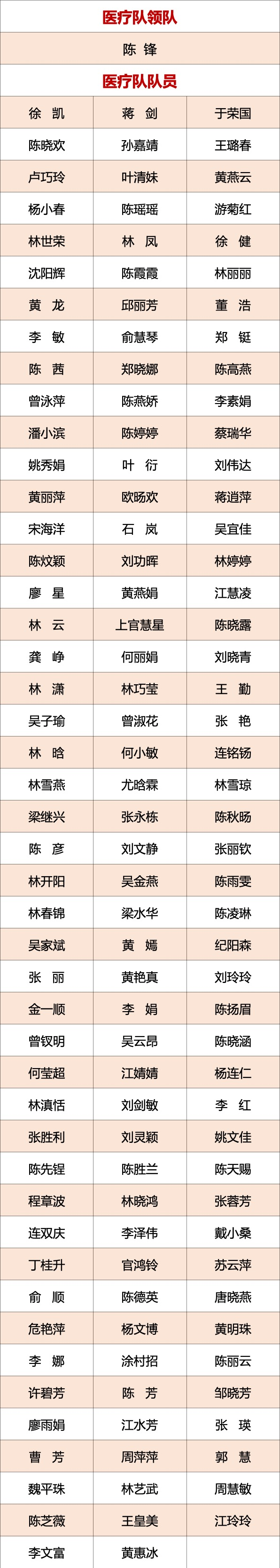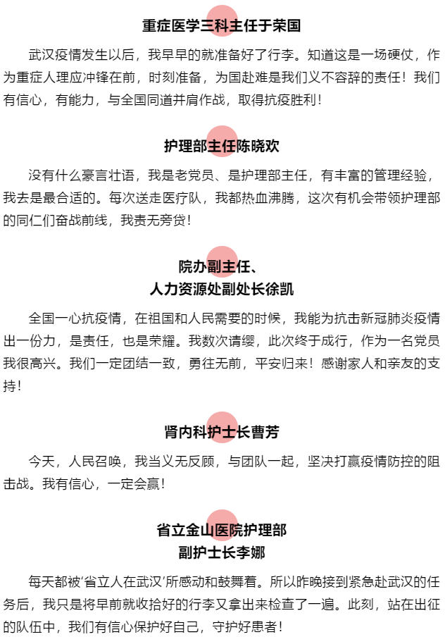 昨日20时,医院接到国务院应对新型冠状病毒肺炎疫情联防联控机制医疗救治组紧急通知,要求组派医疗队支援武汉,整建制接管重症病区。接到任务后,医院连夜紧急部署,职工踊跃报名,3小时完成队伍组建,由副院长、省急救中心主任陈锋同志担任领队。医疗队包括37名医师、100名护士和1名联络员,分别来自急诊医学、重症、呼吸、中医、心血管、麻醉、感染、护理等15个学科。党员71名,院党委连夜决定成立临时党支部,陈锋同志任支部书记,于荣国、陈晓欢、徐凯、蒋剑任支部委员。这是一支汇聚优秀骨干力量的精英团队。
