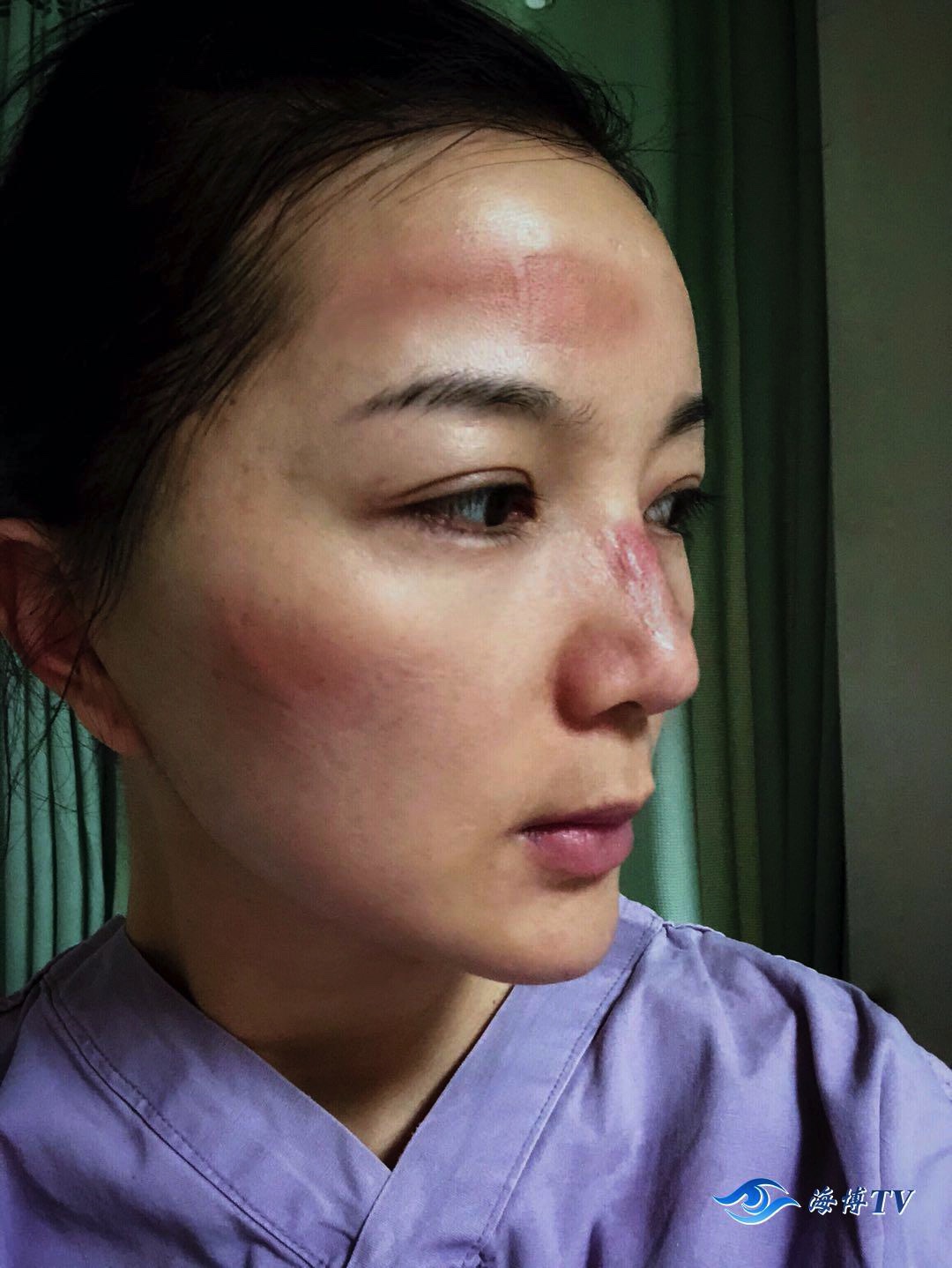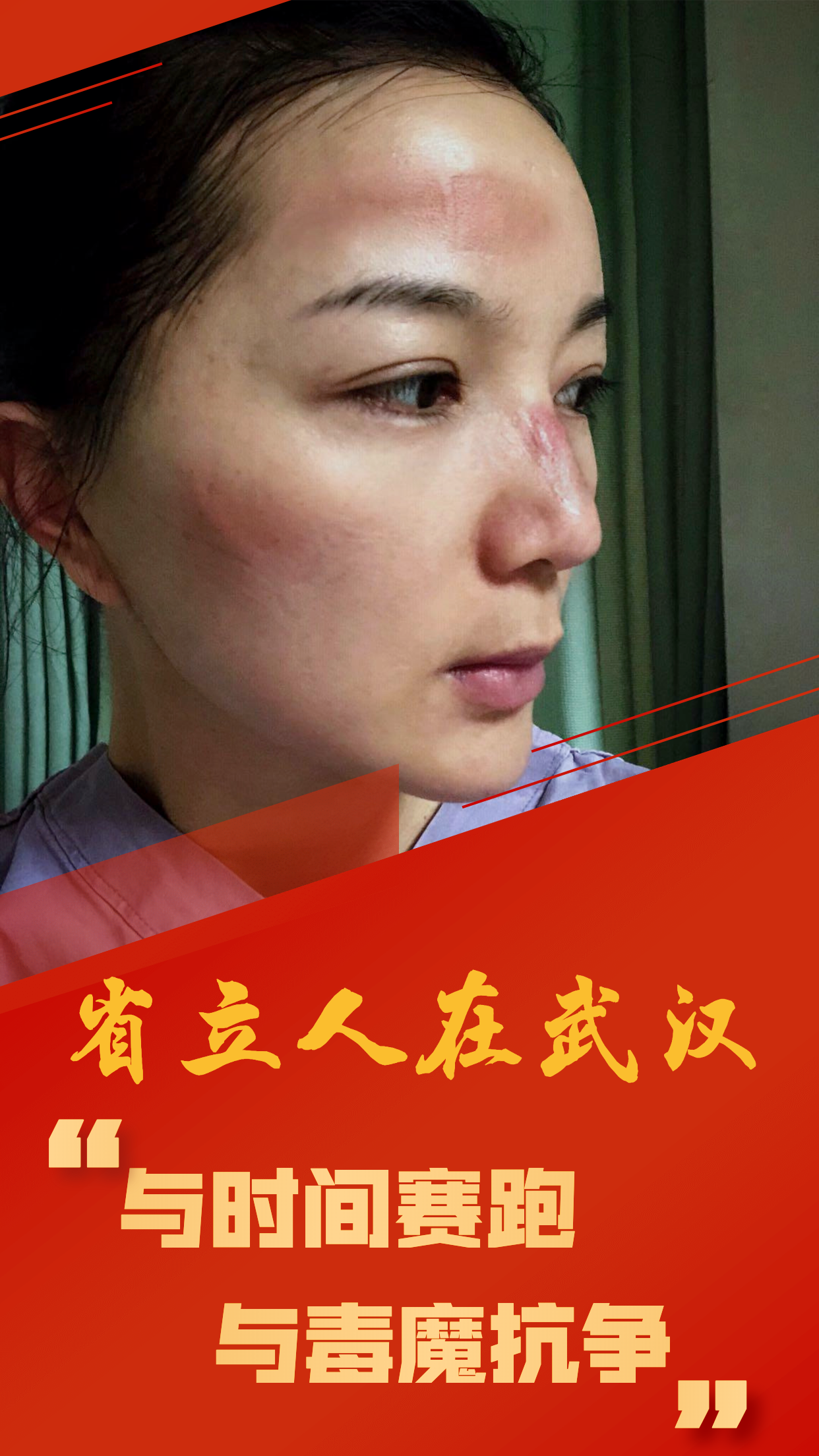 回到休息区,我和战友默契地总结着:在抗疫的征程中,对轻症患者,安抚他们的情绪,做好心理护理,也是我们工作的重点。再看看镜中的自己,头发全湿,脸上和鼻梁上留着红红的压痕和水泡,我们会心一笑:“今天的辛苦,值得!我为亲爱的省立人特别能吃苦,特别能战斗的精神风貌感到无比自豪。