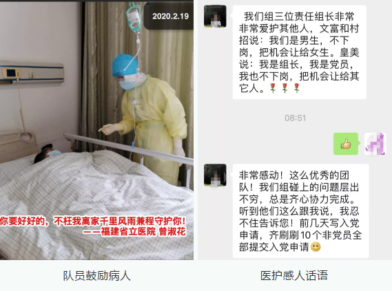 抵达武汉后医疗队首先召开党支部委员会扩大会议,确定委员分工,酝酿组建三个党小组。随后召开党员大会组织集中学习,重温入党誓词,号召全体党员勇于担当、冲锋在前,在荆楚大地展现作为,为武汉人民生命安全和身心健康贡献力量。病区开区当晚,党员干部于荣国、陈晓欢带领第一组医疗护理队伍进驻病房。