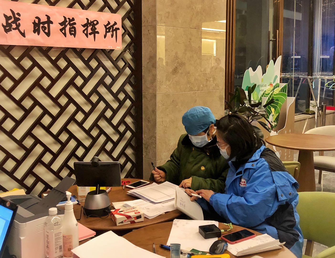 李娜(左)与后勤人员进行驻地消杀工作