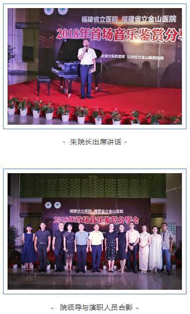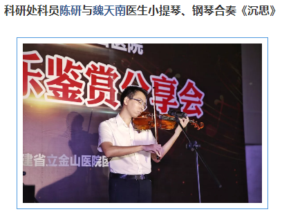 7月24日晚,省立金山医院门诊大厅内琴声悠悠,歌声飞扬。由福建省立医院团委、省立金山医院团委举办的2018年首场音乐鉴赏分享会就在这里举行。音乐会编排独具匠心,表演精彩纷呈,给现场百余名观众献上了一场视听盛宴。院领导朱鹏立、魏世超及部分行政职能科室、临床医技主任出席并一同欣赏演出,观众大部分是本院音乐爱好者,以及住培生、进修生、实习生等。
