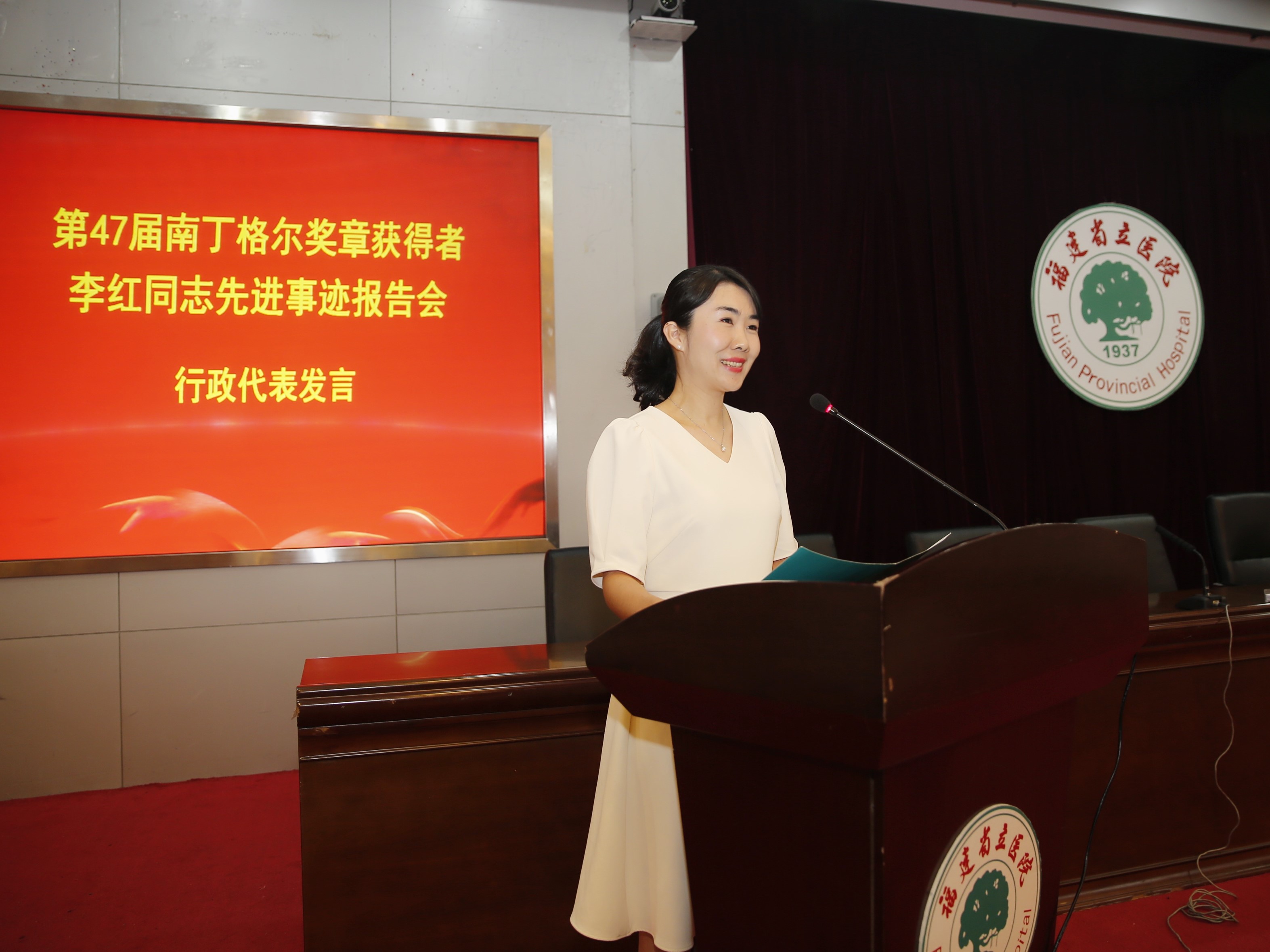 为树立先进典型,传播南丁格尔精神,10月22日下午,福建省立医院、省立金山医院举办学习第47届南丁格尔奖章获得者李红同志先进事迹报告会。全体院领导、两院中层干部三百余人聆听了报告,报告会由陈锋副院长主持。李红同志作题为《精于医术 诚于医德 让南丁格尔精神永放光芒》主题汇报。