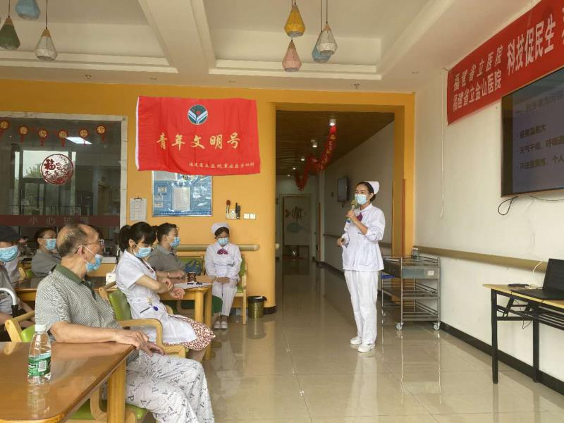 福建省立金山医院重症医学一科青年文明号集体来到国德康养中心,开展以“科技促民生,科普惠健康”为主题的义诊、科普活动。活动现场,医护人员就血压管理、皮肤护理、呼吸功能训练等方面,开展专题讲座,从饮食起居、精神状态和活动指导等方面进行健康宣教,帮助老人解决日常生活中的健康烦恼。