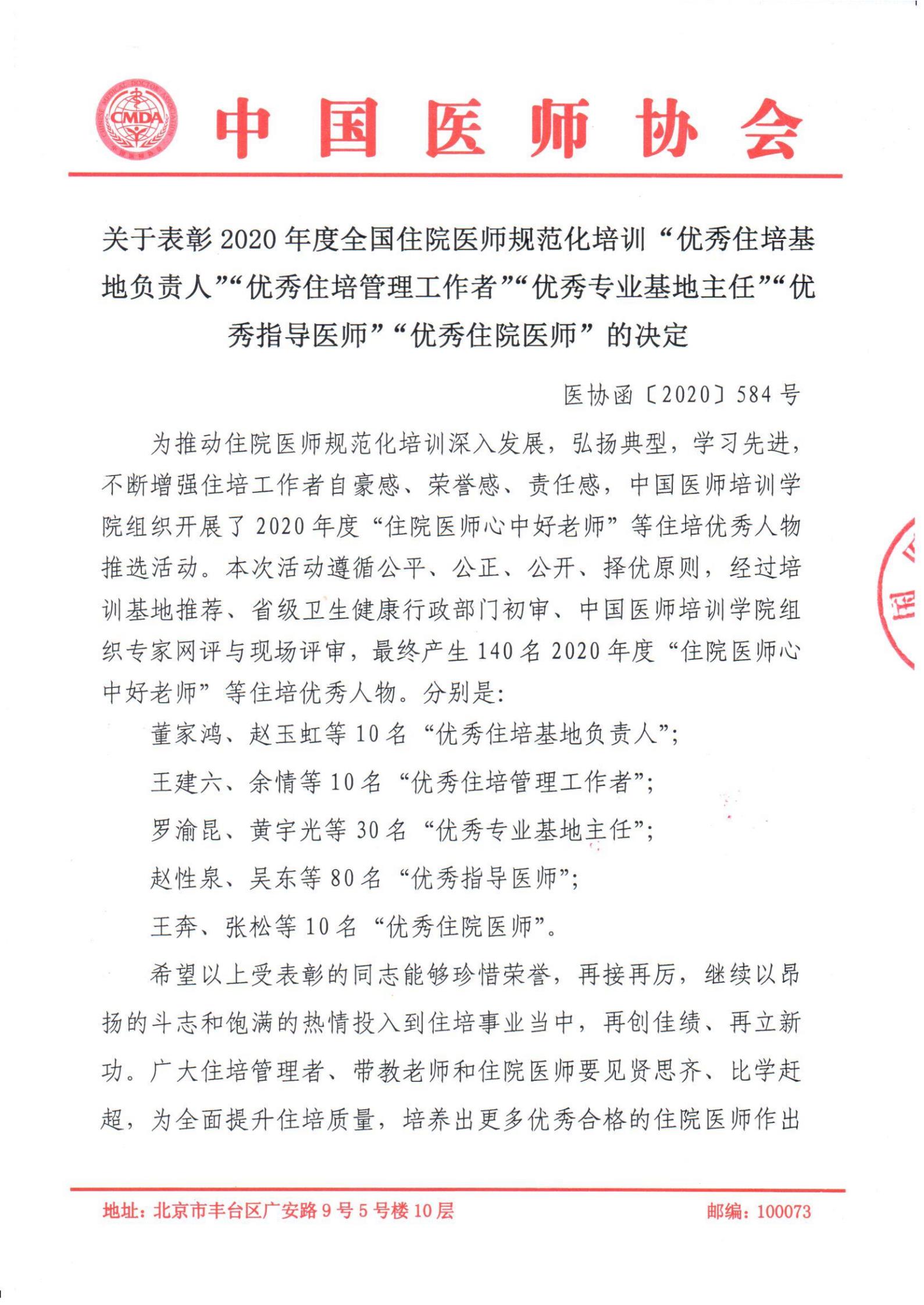 转发中国医师协会“关于表彰2020年度全国住院医师规范化培训“五个优秀”的决定”