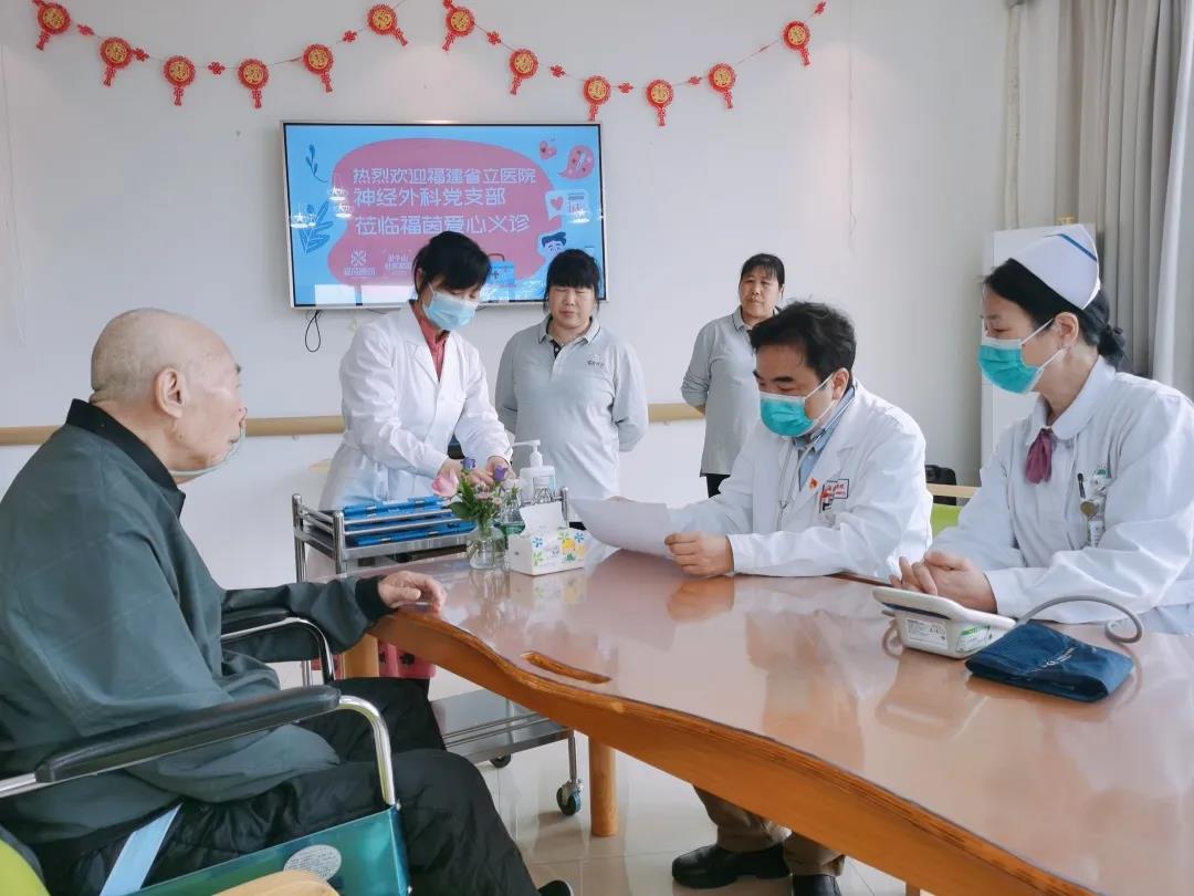 我院神经外科党支部在支部书记温玉星主任医师带领下赴福茵养老院开展爱心义诊活动。医护团队对每一位老人进行床旁巡诊,为预防长期卧床老人患有如肌肉萎缩、关节强直、褥疮,呼吸系统、泌尿系统感染等老年疾病及脑卒中康复理疗提出许多专项的建议,并与福茵养老院建立长期帮扶方案,不断提高福茵医护团队诊疗及护理专业水平,为老人的身体健康保驾护航。