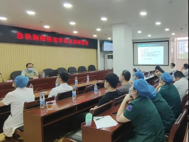 超声科副主任吴松松主任医师带领超声科7名专家,与闽侯县医院超声科深度对接。为进一步加快闽侯县医院胸痛中心建设进程,我院急诊医学研究室副主任柯俊主任医师带队来到现场指导工作,查看抢救室、留观室、绿色通道、急救设备等,并指导心梗患者溶栓治疗。
