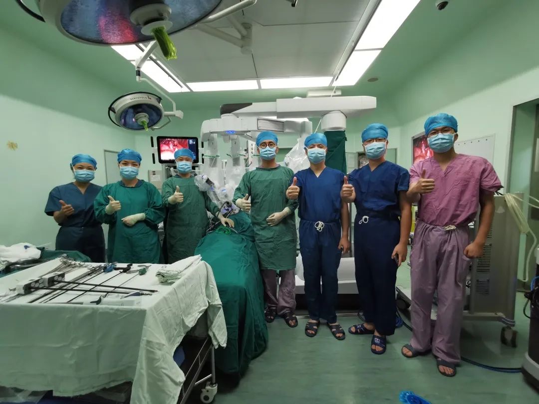 潘小杰主任医师及助手朱立桓主治医师与手术室、麻醉科团队密切配合,通过三个微创的小孔,利用机器人手术机械臂灵活的优势,快速完整切除肿瘤,并规范完成系统性淋巴结清扫。手术过程顺利,用时1.5小时,出血约40ml,术后拔除气管插管后即安返病房。