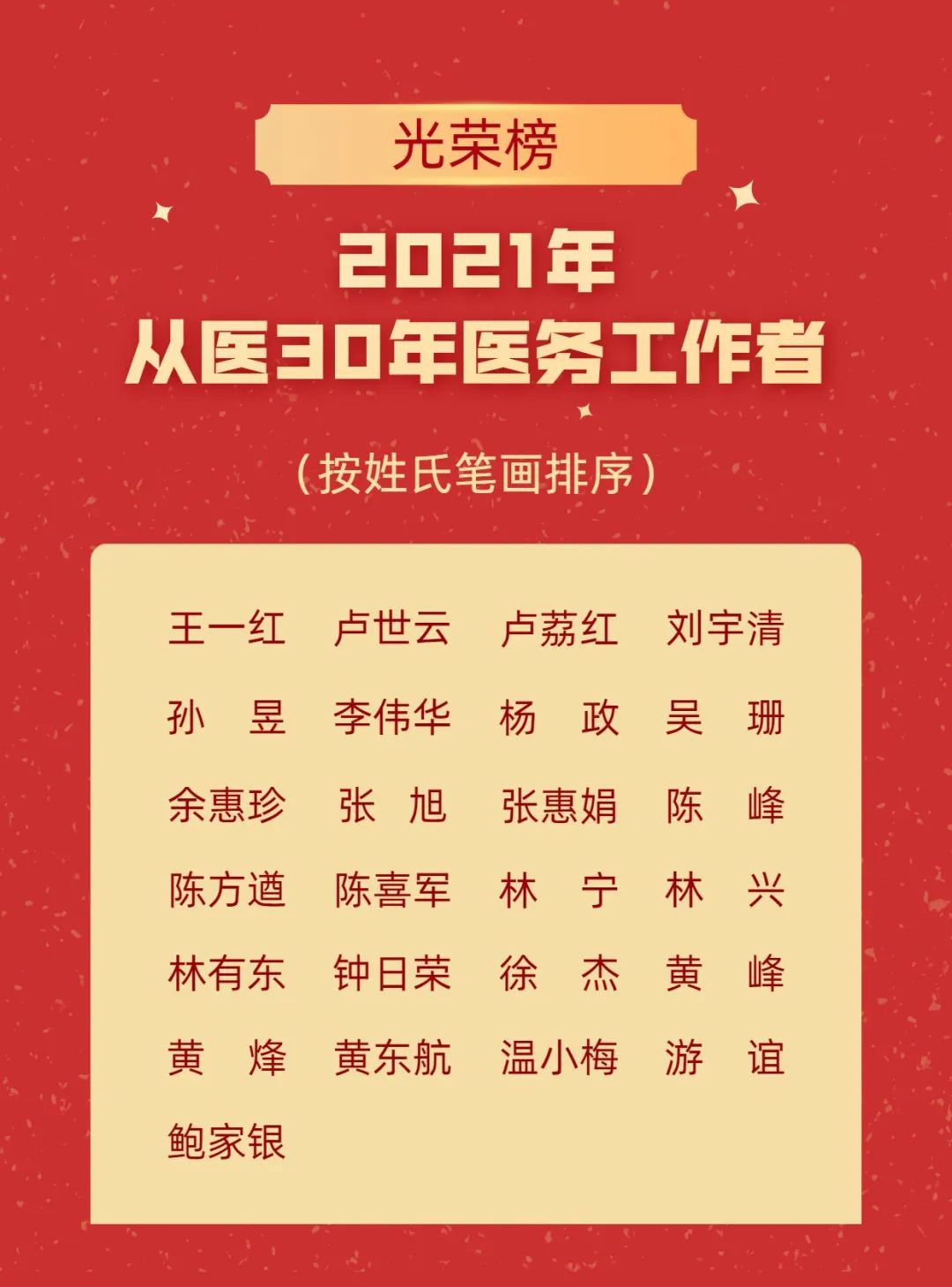 大会宣读了福建省立医院、省立金山医院关于为从医30周年医师(技师、药师)颁发荣誉证书的决定。2021年我院有25位医师(技师、药师)从医满30周年,医院向每位受表彰者颁发证书,感谢他们30年来为八闽大地创造了一个健康的港湾,为一代代年轻的省立人引航。
