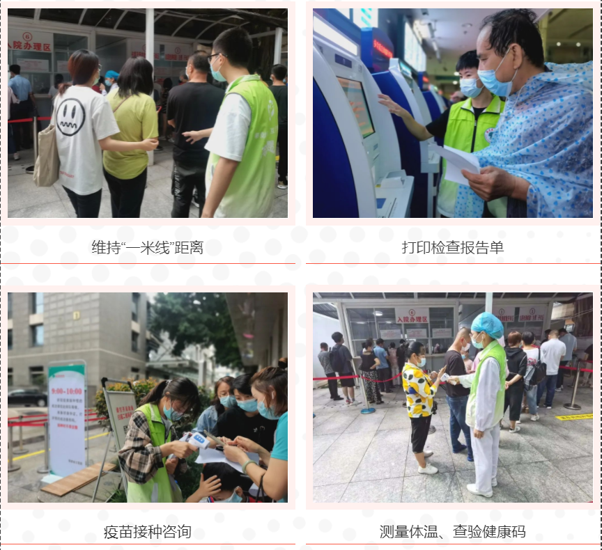为有效控制和降低疫情传播风险,有序开展核酸检测工作,医院实行分时段预约、错峰检测。志愿者们在炎热的室外持续服务3-4小时,平均日接待量达500人次,各时段由4位志愿者分别引导待检测、预约接种疫苗的群众间隔一米有序排队,保持社交距离;为市民答疑解惑;协助老弱病残孕实现预约操作,手机实名登录。在台风天这样恶劣的天气条件下,他们依然坚守岗位,为排队的市民撑伞挡雨,从开单、检测、结算、打报告,护送他们快速顺利完成检测。