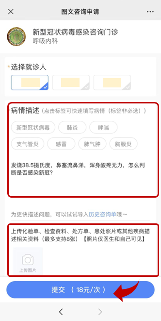 填写病症信息,上传图文报告等资料,并支付。
