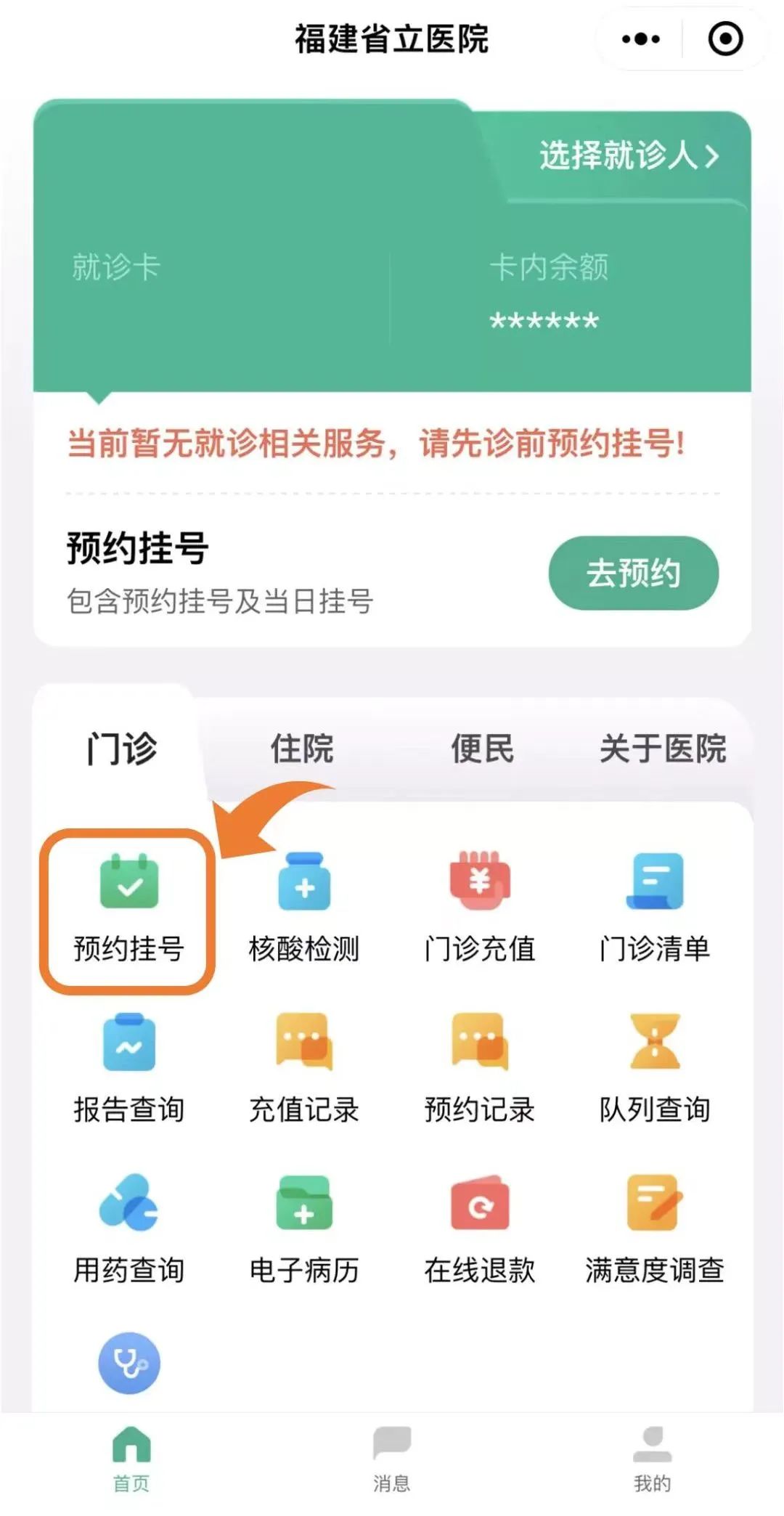 关注“福建省立医院”官方微信号,预约挂号——健康管理科。请您根据预约时间,前来福建省立医院健康管理科(2号楼8层),由医生针对您的具体情况制定个性化体检项目