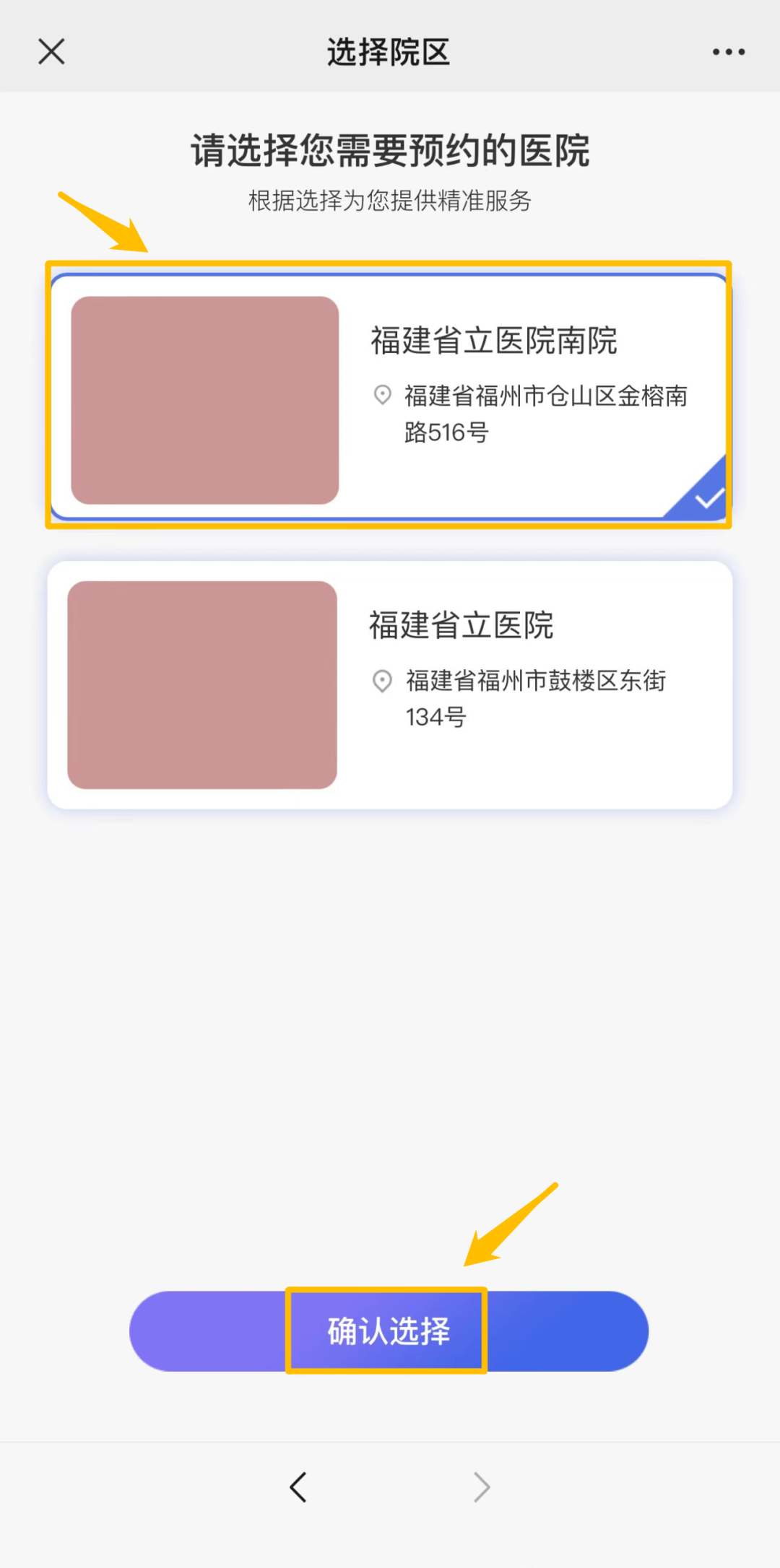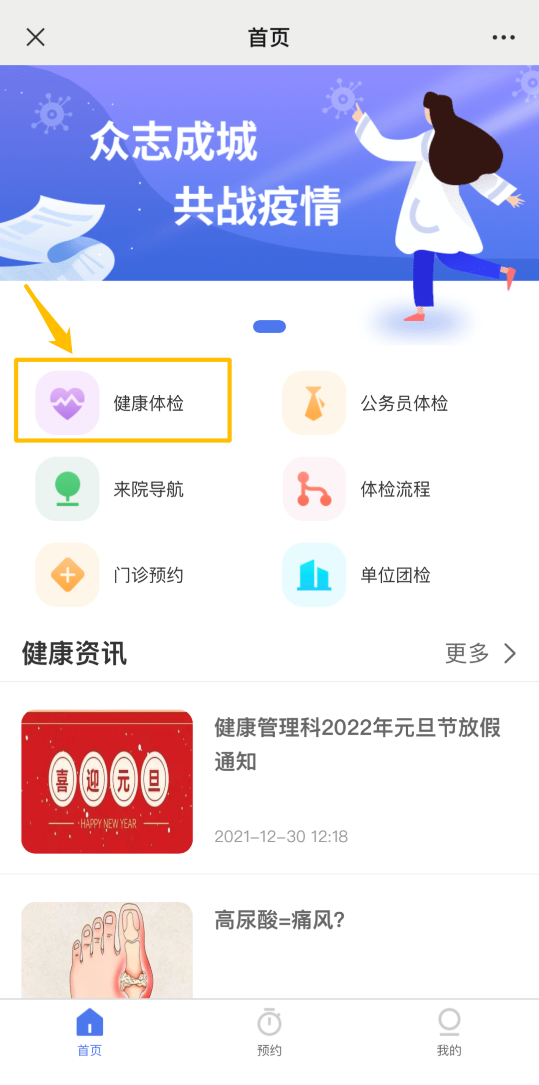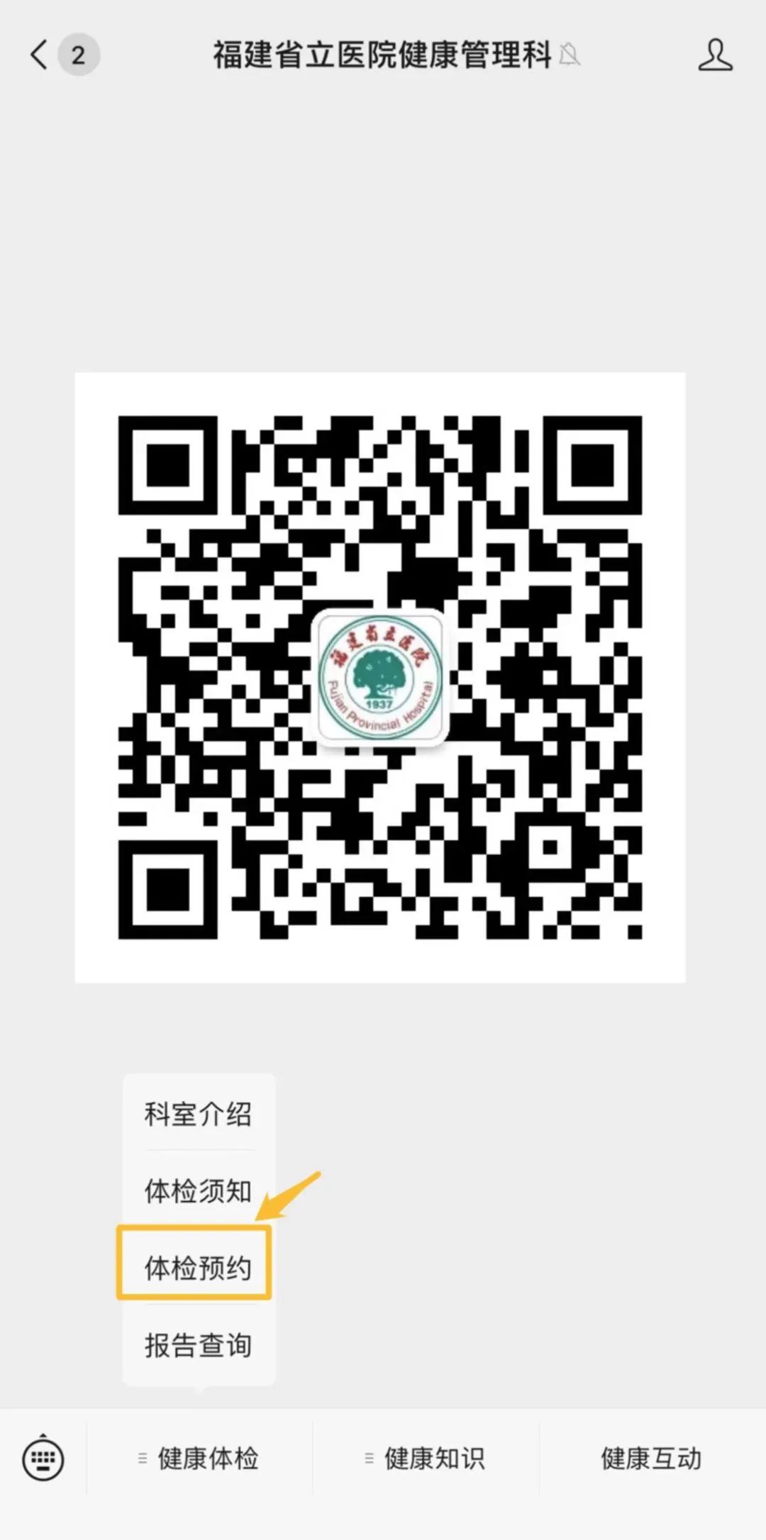 关注“福建省立医院健康管理科”微信号,点击体检预约,选择“福建省立医院南院”。