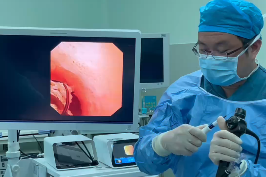 ▲朱伟副主任医师在操作电子软镜处理离体肾脏结石