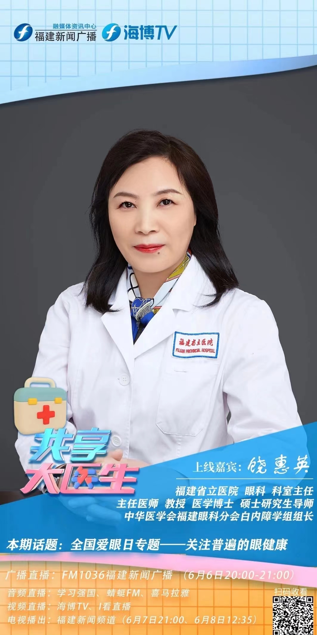 饶惠英主任受邀在福建新闻广播电视台“共享大医生”栏目开展专题大讲堂,内容涵盖青少年近视防控、中青年干眼预防和老年人白内障治疗等话题。通过科普活动,培养公众正确用眼观念,守护每个人的光明未来。