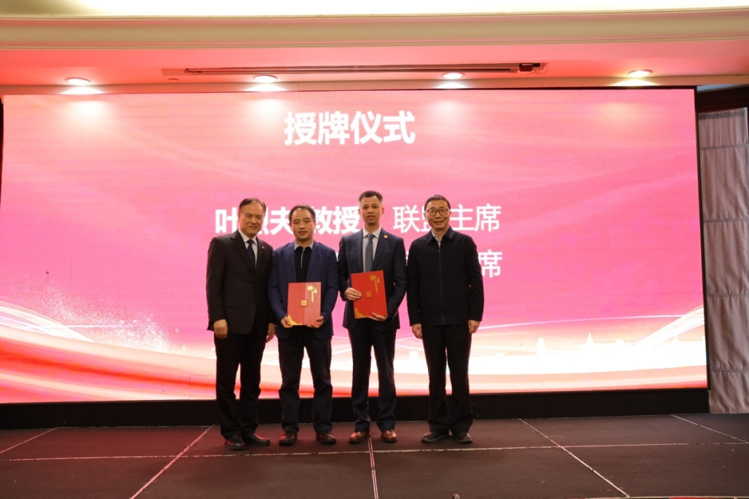 ▲朱鹏立书记和谢立平教授为叶烈夫、朱庆国颁发联盟主席聘书
