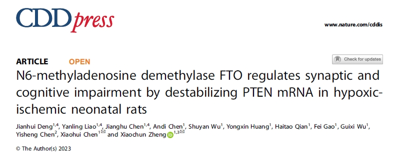 郑晓春教授团队在新生儿缺氧缺血性脑损伤的发病机制方面取得新成果,团队在中科院一区TOP期刊Cell Death & Disease杂志在线发表了题为“N6-methyladenosine demethylase FTO regulates synaptic and cognitive impairment by destabilizing PTEN mRNA in hypoxic-ischemic neonatal rats”的研究论文。该论文从临床问题出发,解析新生儿缺氧缺血性脑损伤的认知功能障碍发生相关机制,为其治疗提供了新思路。本文的第一作者为麻醉科邓健慧医师,共同第一作者为廖燕凌副主任医师、陈江湖副主任医师,通讯作者为郑晓春教授和陈晓辉副主任医师。