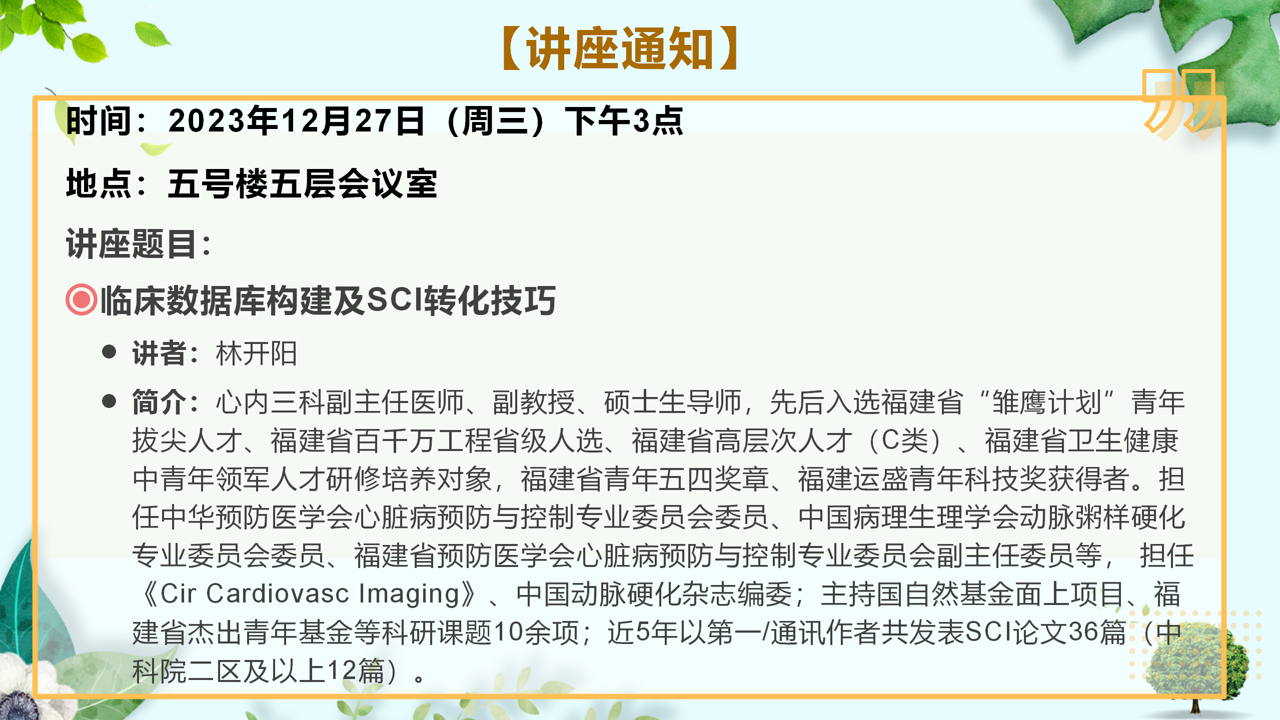 [讲座通知]临床数据库构建及SCI转化技巧,2023年12月27日 (周三) 下午3点
