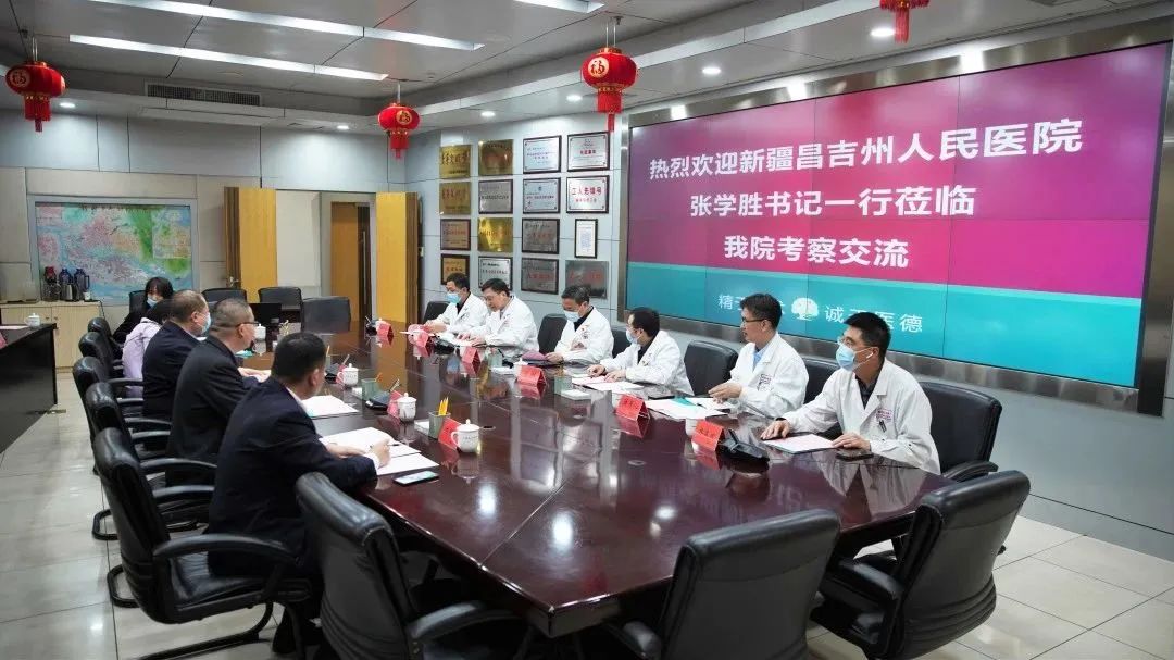 近日,新疆昌吉州人民医院党委书记张学胜一行莅临我院参访。我院院领导朱鹏立、陈刚、郑铭、薛芳沁以及部分行政职能科室负责人、援疆干部人才等参加座谈会。