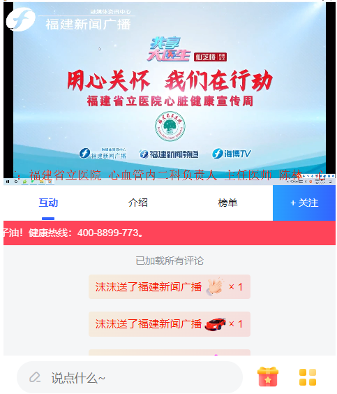 近日,我院郭延松教授领衔8位心血管内科专家,通过福建省广播影视集团融媒体直播间,开启“用心关怀 我们在行动”《共享大医生》心脏健康专场直播周。
